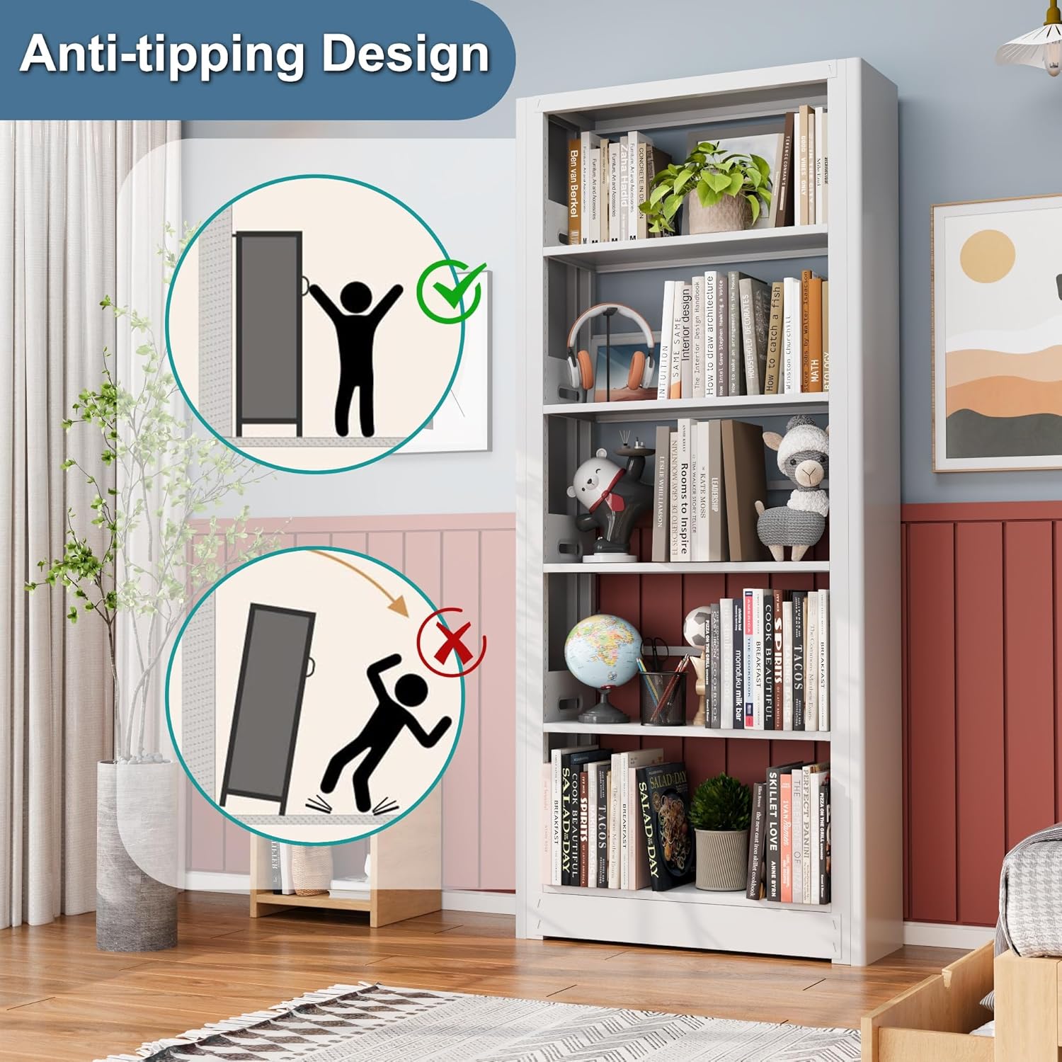 - ă5 Shelves Vertical Storage Display SpaceăOpen bookshelf has 5 tiers, you can adjust the height at will according to your needs, use it to place heavy books, trophies, vinyl records, and potted plants. Meanwhile, the metal shelves come with adjustable stoppers to protect your items from falling. If the 5-Tier shelf cannot meet the storage needs, you can also purchase additional layer board.