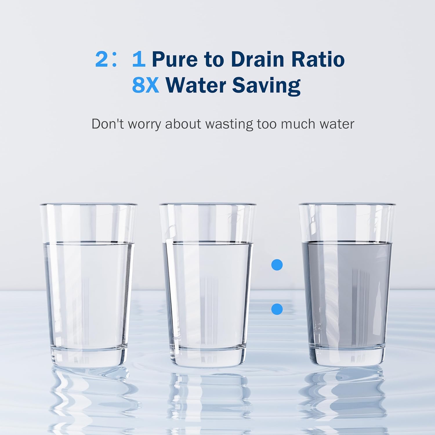- [2:1 Pure to Drain Ratio] Thanks to the innovative water saving technology, the PX600 under sink reverse osmosis reverse osmosis features with 2:1 super low pure to drain ratio. Save 600% of water compare to traditional RO system. Being both economic and environmental-friendly, the RO system makes your water bills more affordable. Over the life of the system, the PX600 RO filter system pays for itself in water savings!
