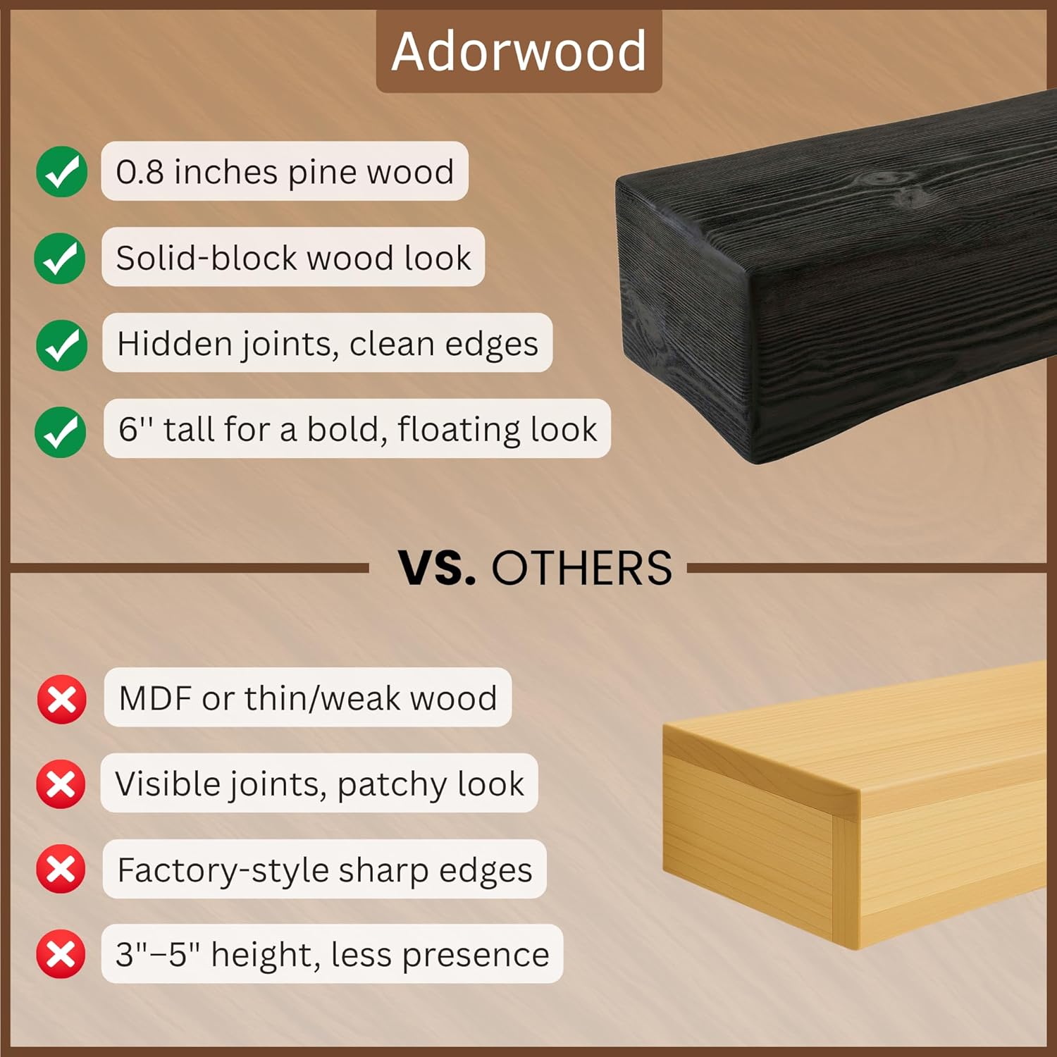 - GENUINE PINE WOOD TEXTURE: Each piece reveals natural knots, small cracks, and unique distressing, ensuring every mantel is one-of-a-kind. Due to the inherent characteristics of real wood, the grain and color may slightly differ from the samples shown.