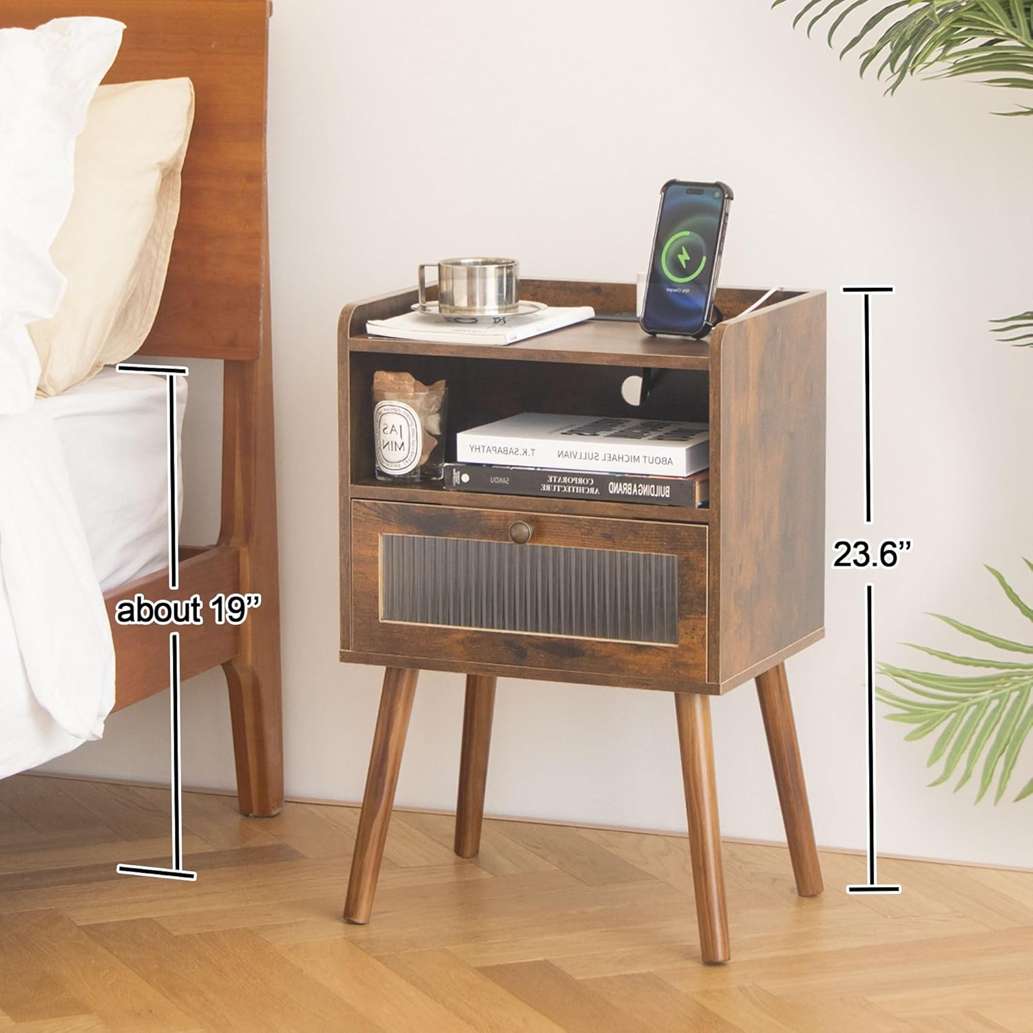AWASEN Mid Century Night Stand with Charging Station, Wood Bedside Table with Glass Drawer, Small Modern Nightstand End Side Table with 2 Tiers Storage for Bedroom, Office(Rustic Brown)