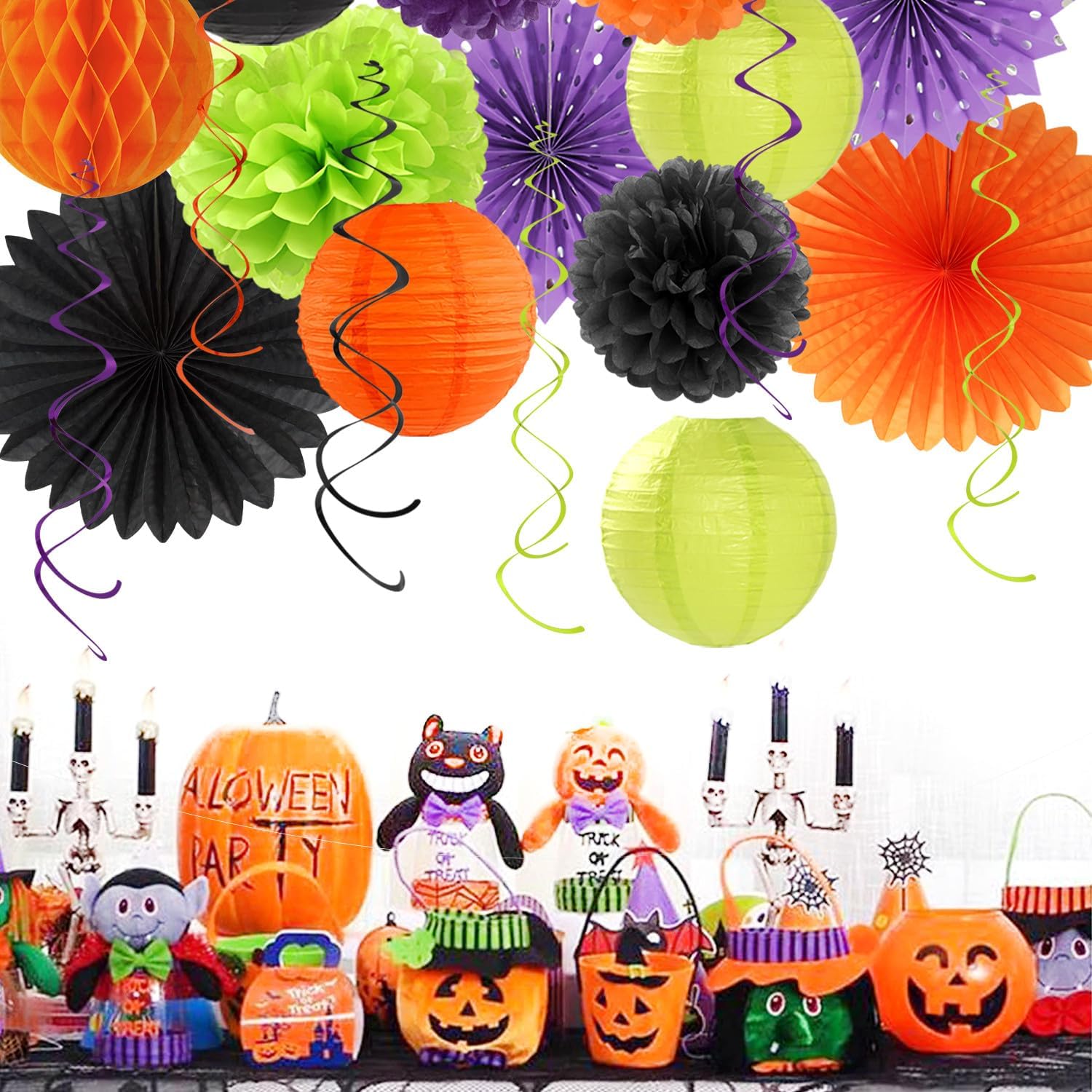 Black-Green Orange-Purple Halloween Birthday Party-Decorations - 21pcs Happy Banner,Paper Lanterns Honeycomb,Tissue Pom Poms Flower Fan,Kids Classroom Hanging Streamers Garland Decor Supplies Huglony