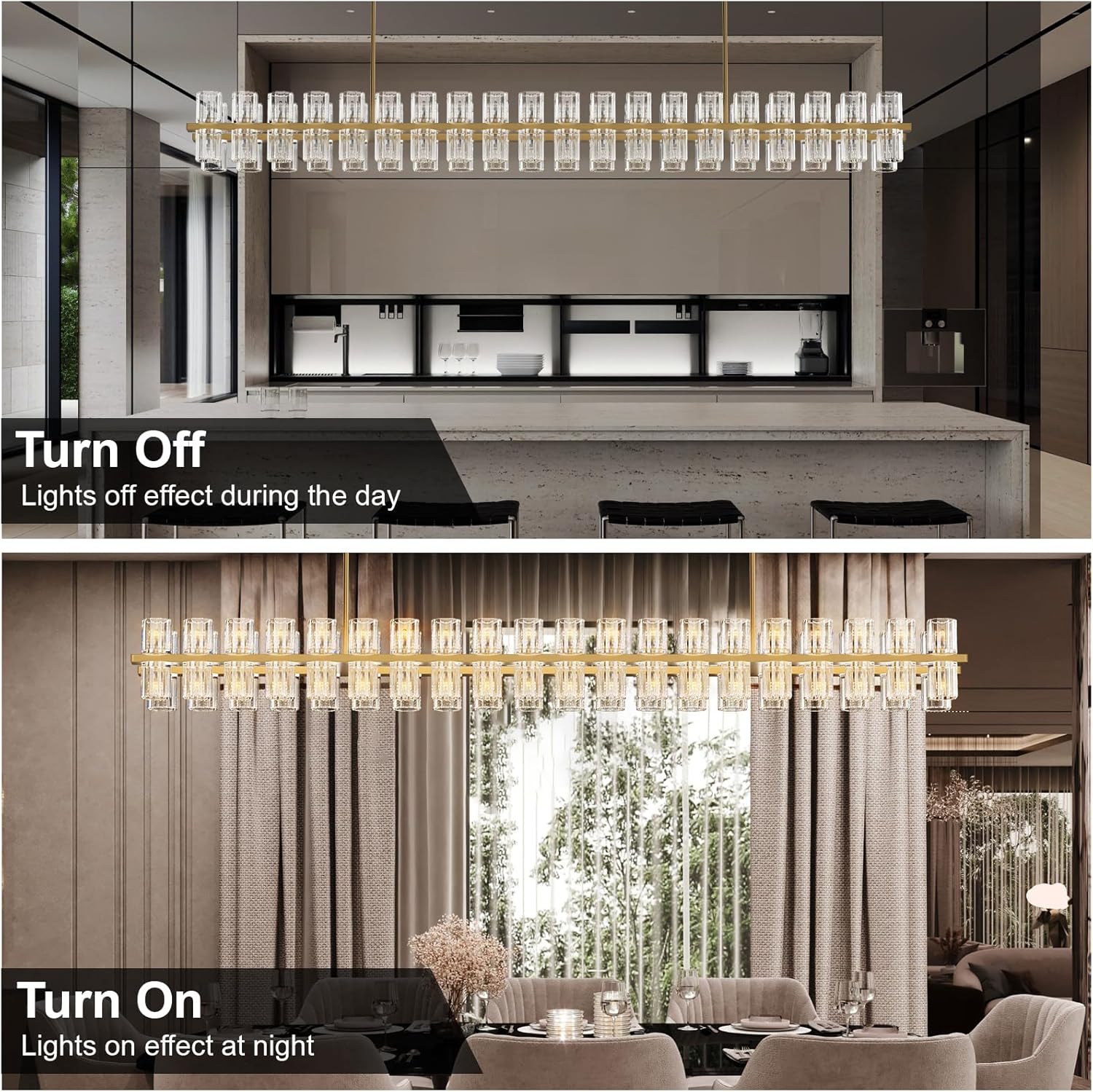 - Height Adjustable: Luxury chandeliers a rectangle design, this modern gold chandelier light fixture measures 72 inches in length, 8.3 inches in width, and 9 inches in height. It comes with four 18-inch length adjusting rods, allowing for a maximum height of 101 inches. With a weight capacity of up to 61 pounds, it's perfect for modern minimalist aesthetics.