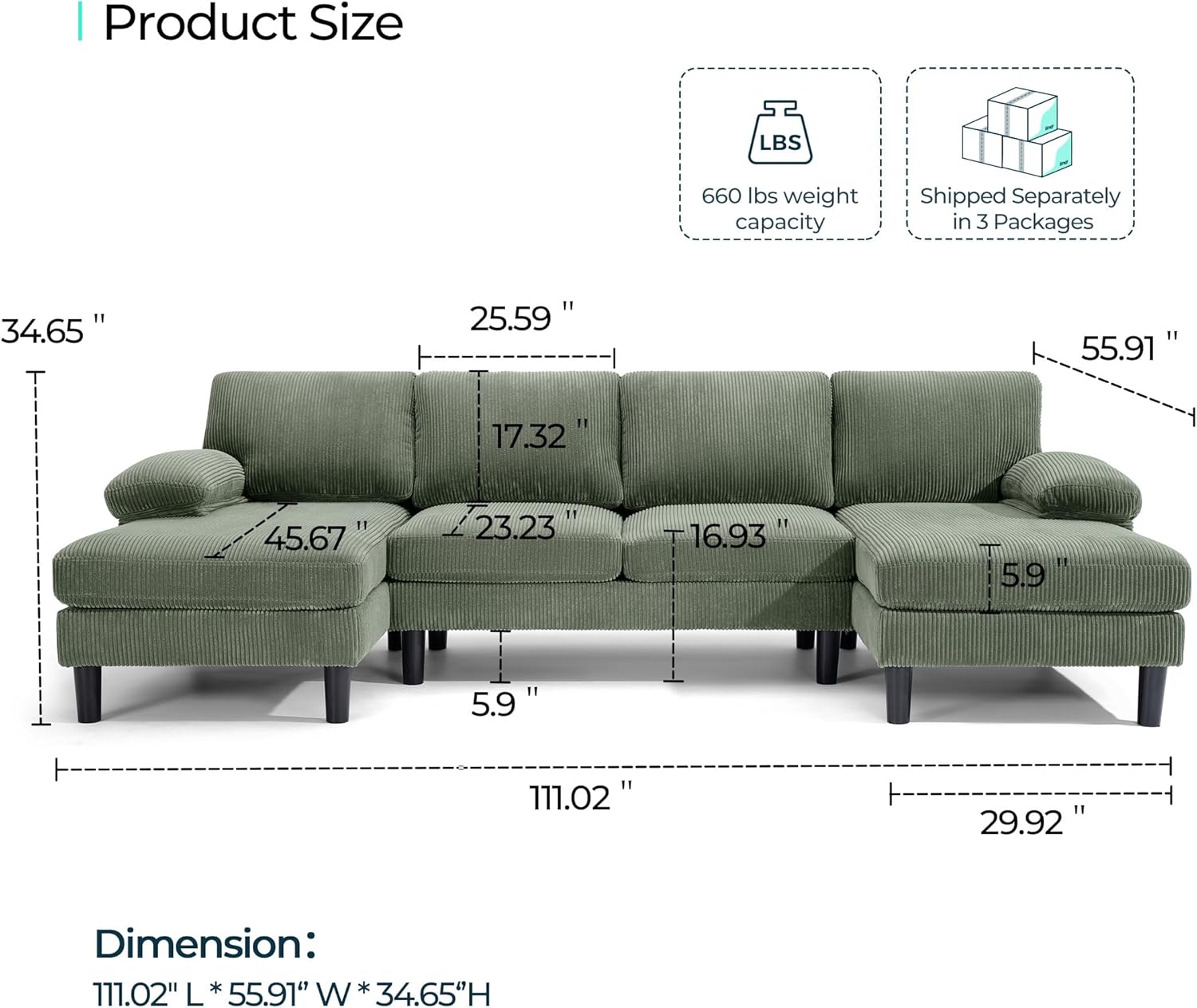 LINSY HOME Sectional Couch, 111'' W Corduroy U Shaped Sofa with Sleepable Armrests, 4 Seat Couch with Double Chaises, Deep Seat Sofa for Living Room, Army Green