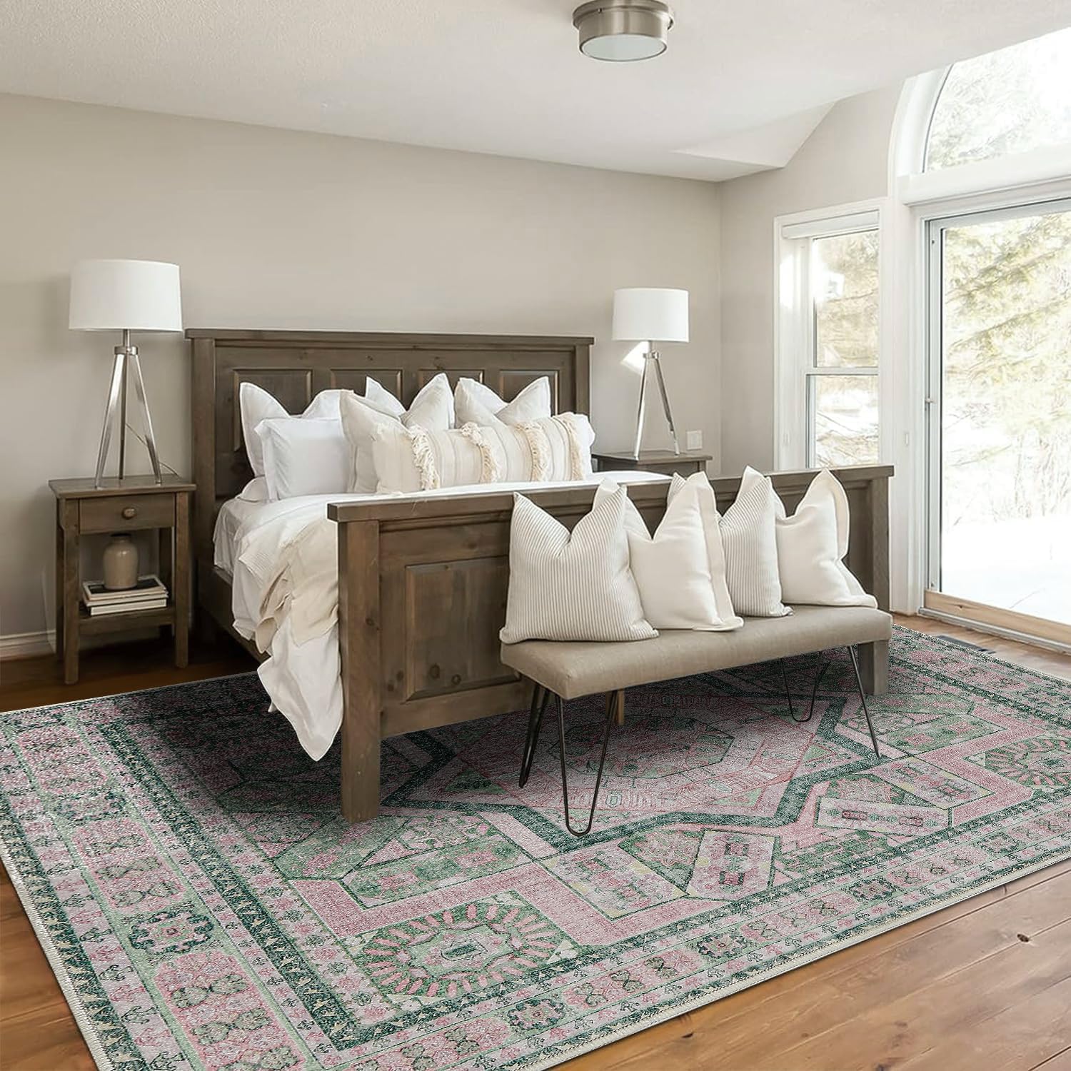 DCX Washable 8x10 Area Rug, Soft Machine Washable Non Slip with Rubber Backing Vintage Rug, Kid & Pet Friendly Living Room Area Rugs 8x10, Foldable Rugs for Bedroom Dining Room Office-Pink & Green