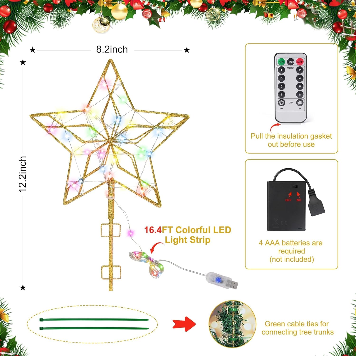 - Nice Size On Top Of Christmas Tree:Christmas star topper is about 8.2'' L X 12.2'' H,translucent USB cord with 50 Led lights is about 16.4 FT length (part of lights are wrapped around and fixed in the star already and able to attain multi functions). A specially designed pole at the bottom so that the Christmas star topper can be fixed to the different sizes of the Christmas tree and easy to hide. Elegant and refined touch Christmas topper for upcoming Christmas holiday