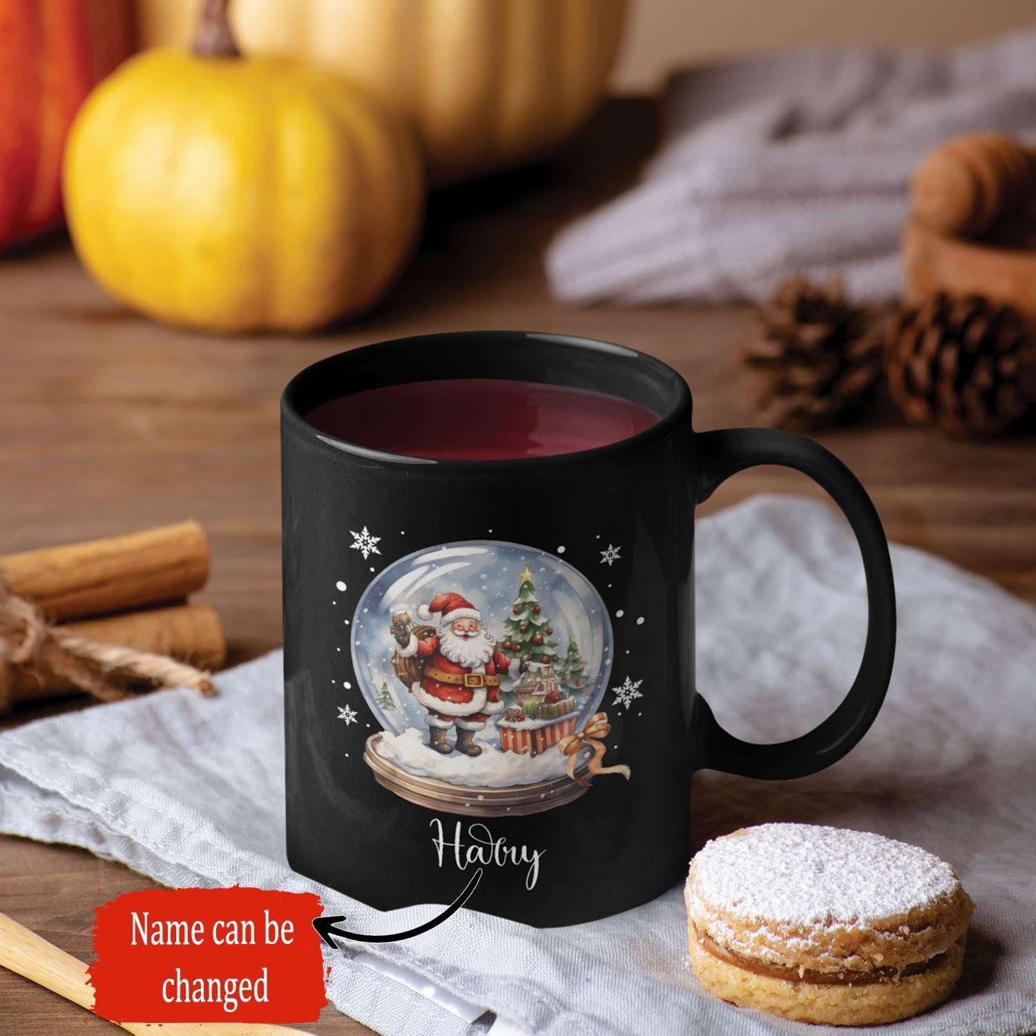 Custom Snow Ball Design Mug With Name, Personalized Black Cup 11oz 15oz, Snow Ball With Santa Claus And Christmas Tree Inside Design, Customized Christmas Themed Coffee Cup