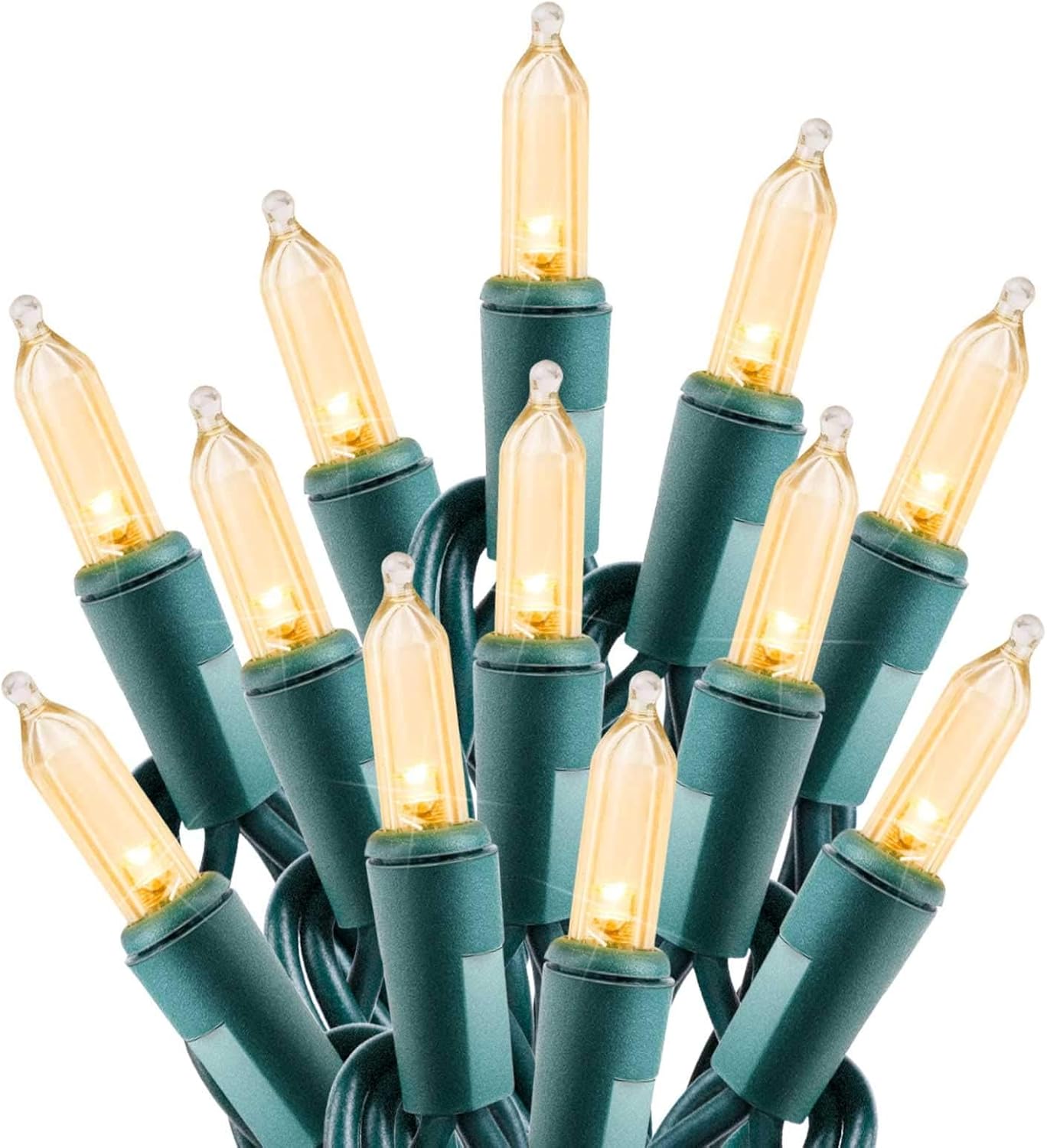 - Creative mini Christmas lights: These white Christmas decorations lights include 200 led mini-light bulbs, 67 feet of green wires, and each bulb is 3.9 inches apart, sufficient length for long-distance lighting. These 360Âş sparkling string lights can not only provide good lighting effects but also bring a more romantic festive atmosphere