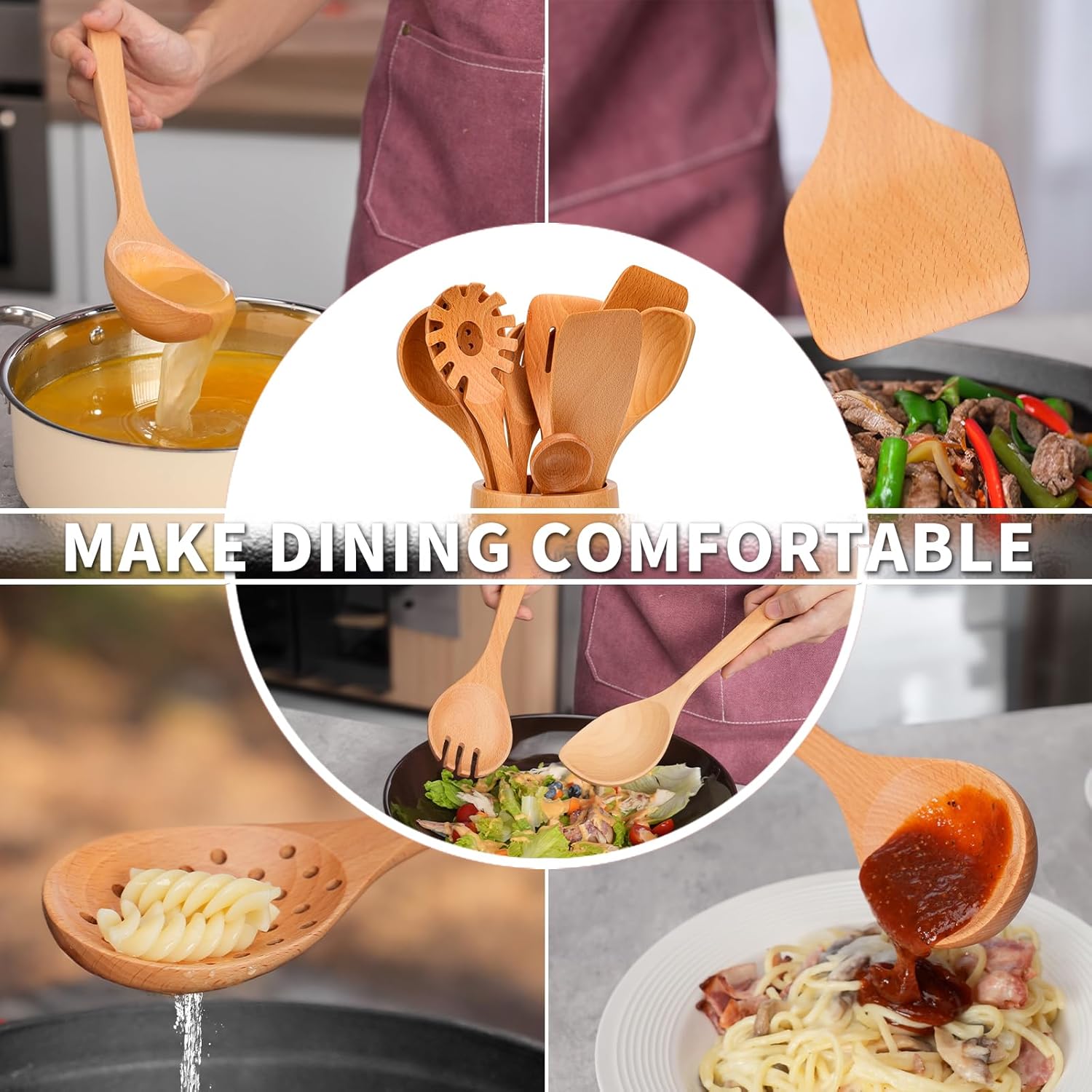 11 PCS WOSPONFAN Kitchen Utensils Set - Wooden Spoons for Cooking, Natural Beech Wood Wooden Utensils - Includes Wooden Spoons, Spatula Set, Slotted Spoon - Handmade Wooden Spoon Set