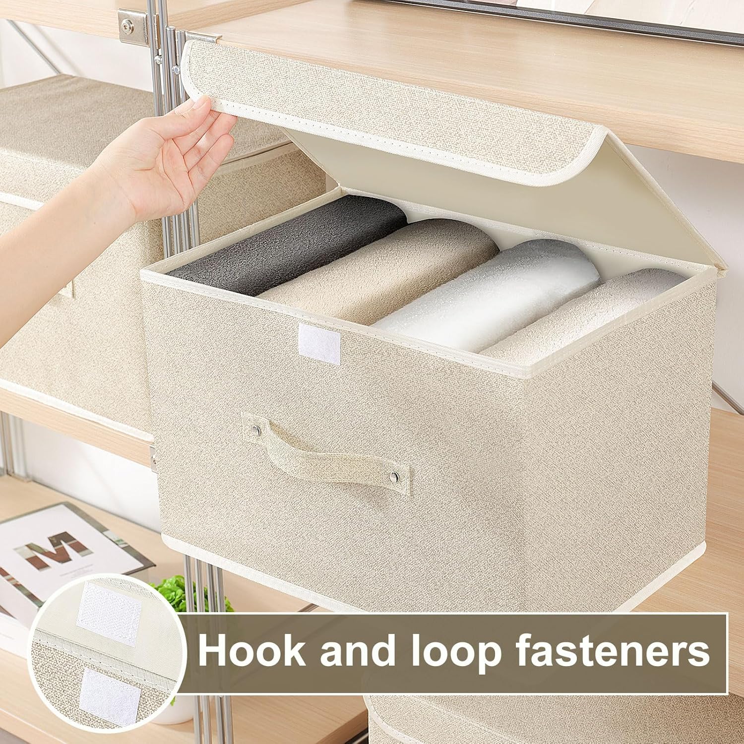 Storage Boxes, Collapsible Storage Bins with Lids, Cotton and linen cloth Storage Baskets with Handle, for Books, Closet, Bedroom, Home, 15x9.8x9.8 in, Grey and Beige