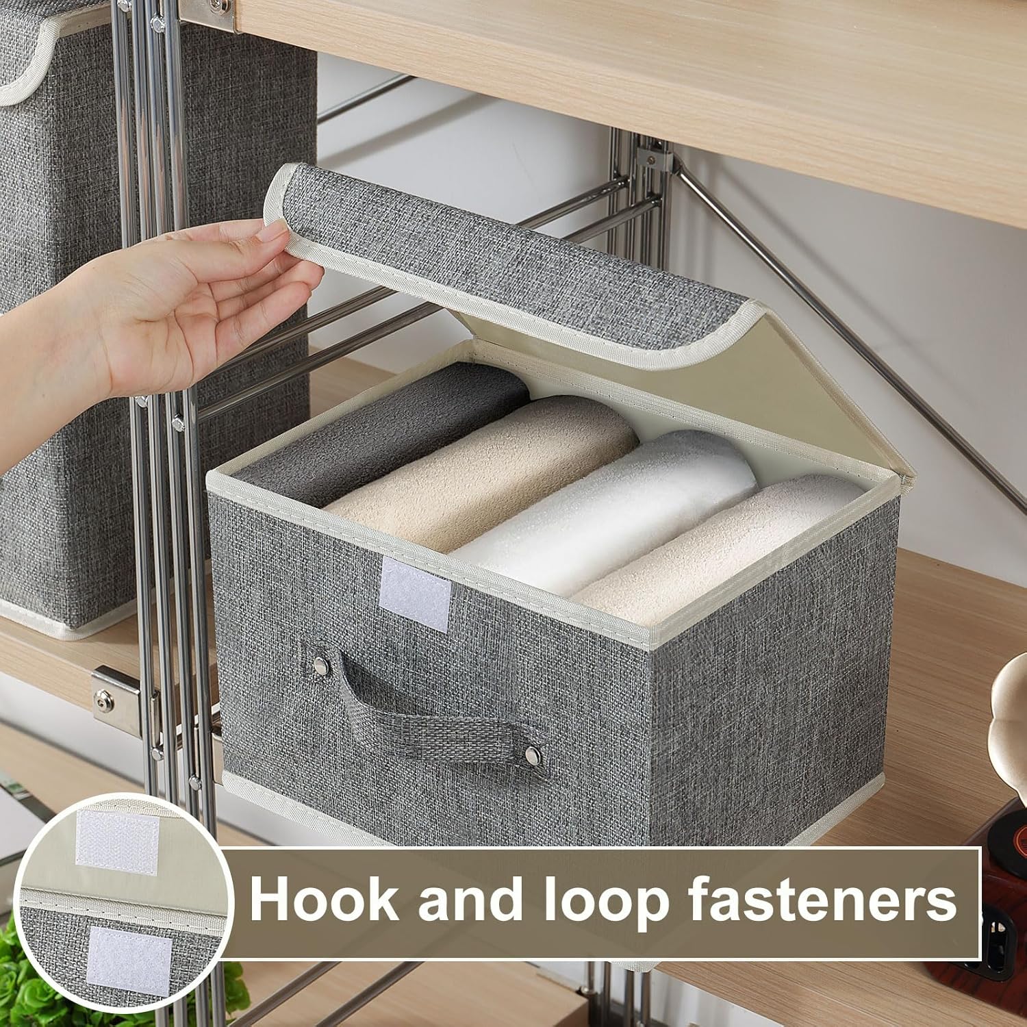 Storage Boxes, Collapsible Storage Bins with Lids, Cotton and linen cloth Storage Baskets with Handle, for Books, Closet, Bedroom, Home, Grey, 3 Pack 10.2 X 7.9 X 6.7in