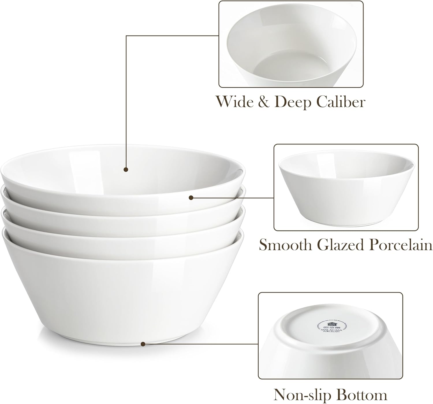 - Versatile & Heat Management -- MALACASA ivory white bowls set of 4, each bowls boast a generous 35 oz capacity, perfect for a variety of dishes, from hearty soups and salads to cereal and pasta. While our large soup bowls are designed to retain heat for longer enjoyment, it's recommend using a napkin or cloth when handling hot soup or other warm dishes to avoid scald.