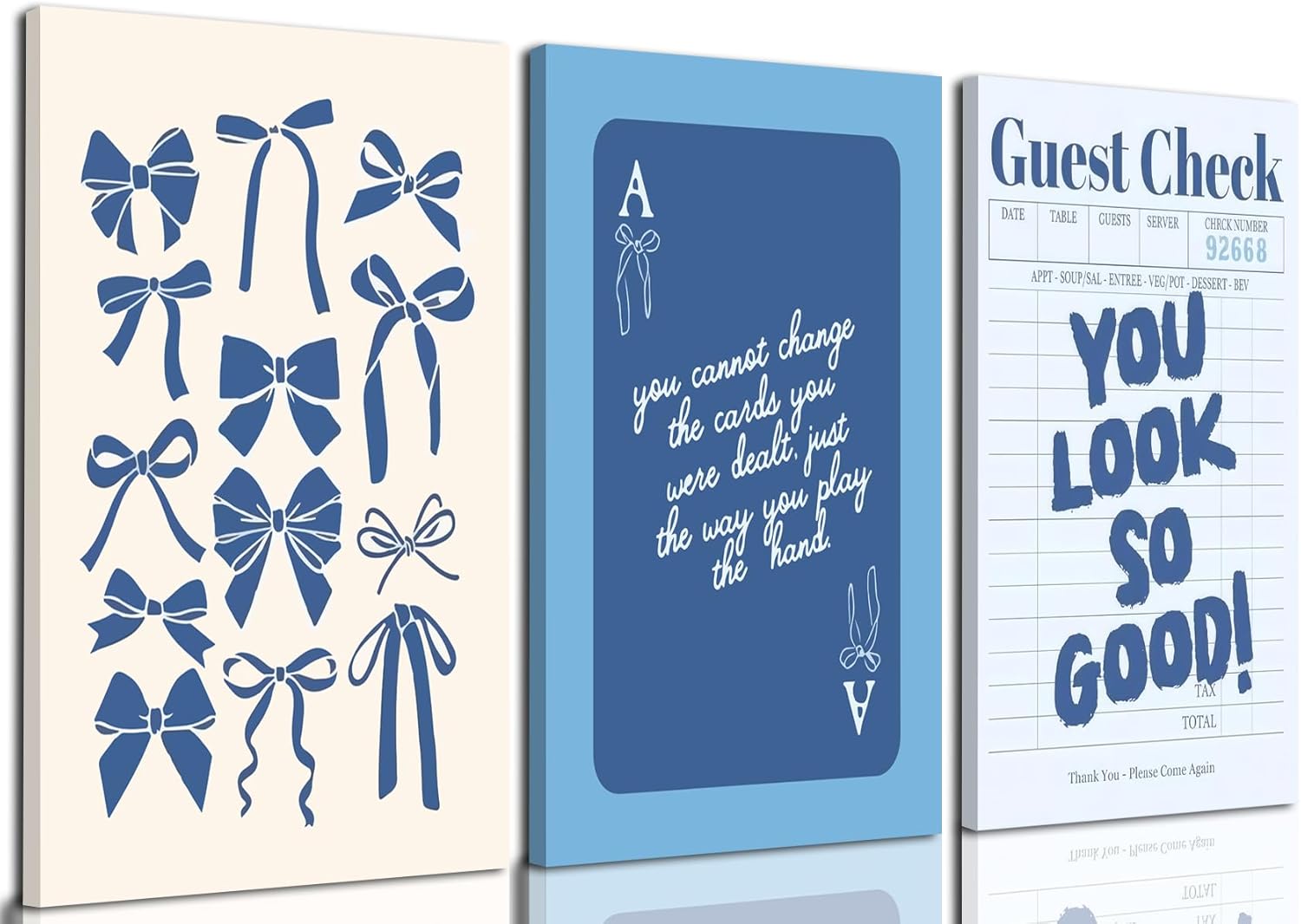 - Navy Blue Preppy Wall Art: This Blue Preppy Wall Art set includes three posters featuring navy blue bows, retro guest check designs, and minimalist poker cards, the fun, vibrant colors and designs make it ideal for enhancing any coquette room decor.perfect for adding a trendy aesthetic to your space.