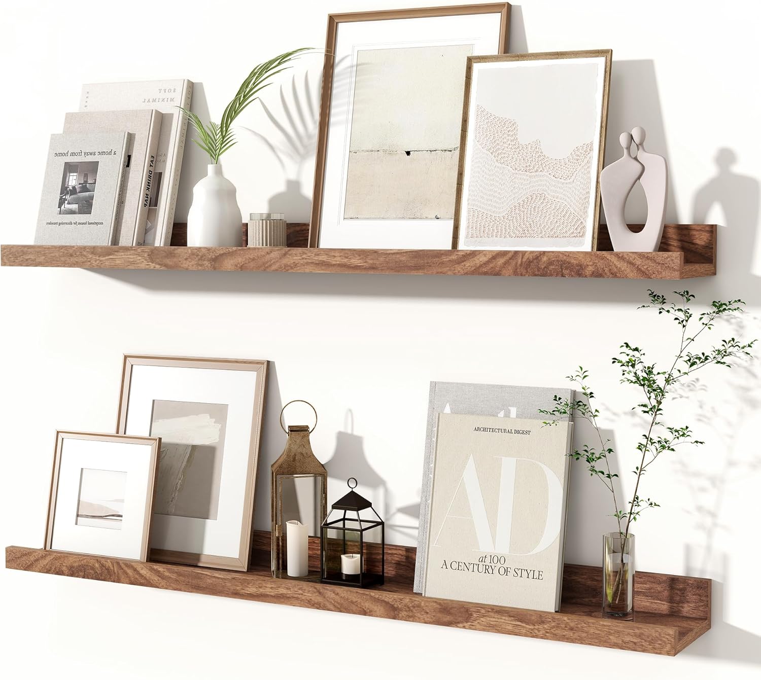 Fun Memories Picture Ledge Shelves Set of 2, 24 Inch Rustic Wall Mounted Floating Shelves with Lip for Home Storage and Décor in Bathroom, Kitchen, Nursery, Bedroom, Living Room, Walnut