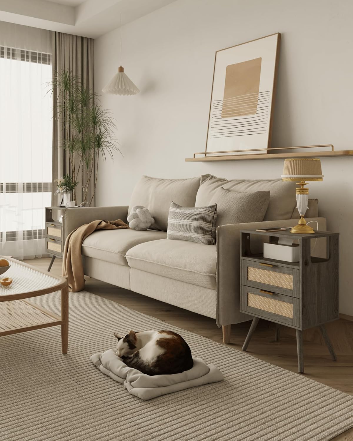 - Embrace the farmhouse touch: A classic grey oak with rattan face, this nightstand gives off a farmhouse touch in your bedroom. With a row insert makes it more practical, the atmosphere lamp is a good addition to the fun of life, it can also be used as a side table or coffee table for the whole family to attract attention, adding elegance to family life.