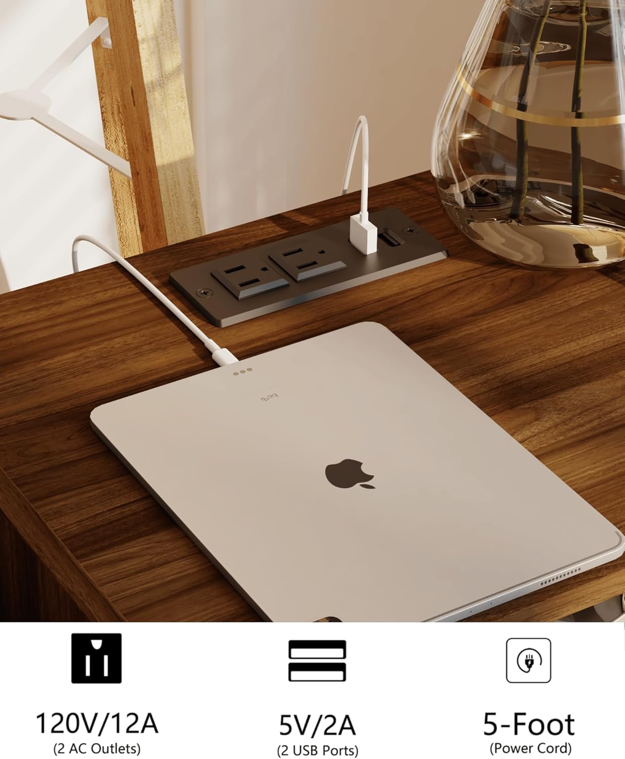 Rattan Nightstand with Outlet,Modern Bedside Table with Storage Drawer and Open Wood Shelf, for Living Room, Bedroom and Small Spaces, Accent Night Stand with Solid Wood Legs,Walnut Brown