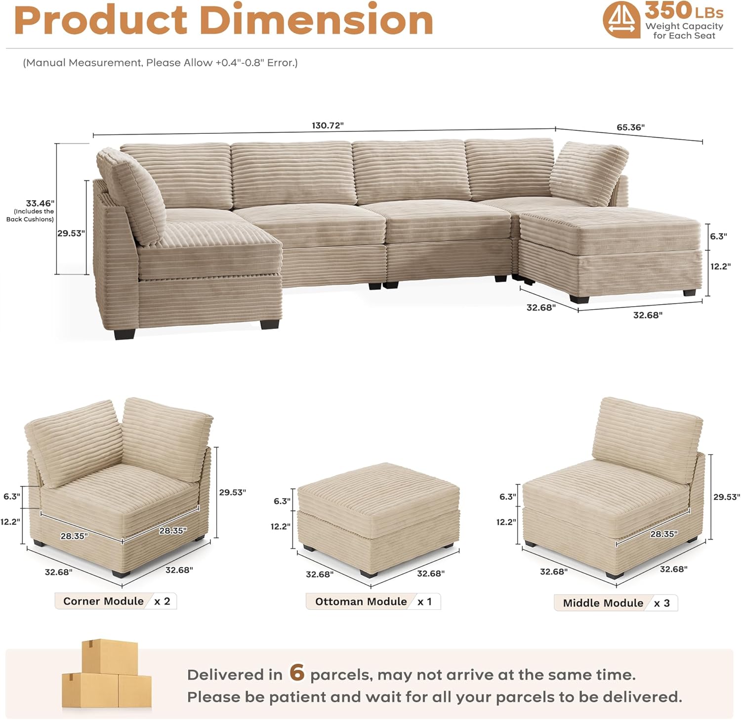ovios Sectional Sofa Couch with U-Shape Chaise Sofa Bed, Comfy Modular Cloud Couches with Deep Seat, Modern Upholstered Plush Corduroy Sofas Set for Living Room, 6-Seater, Beige