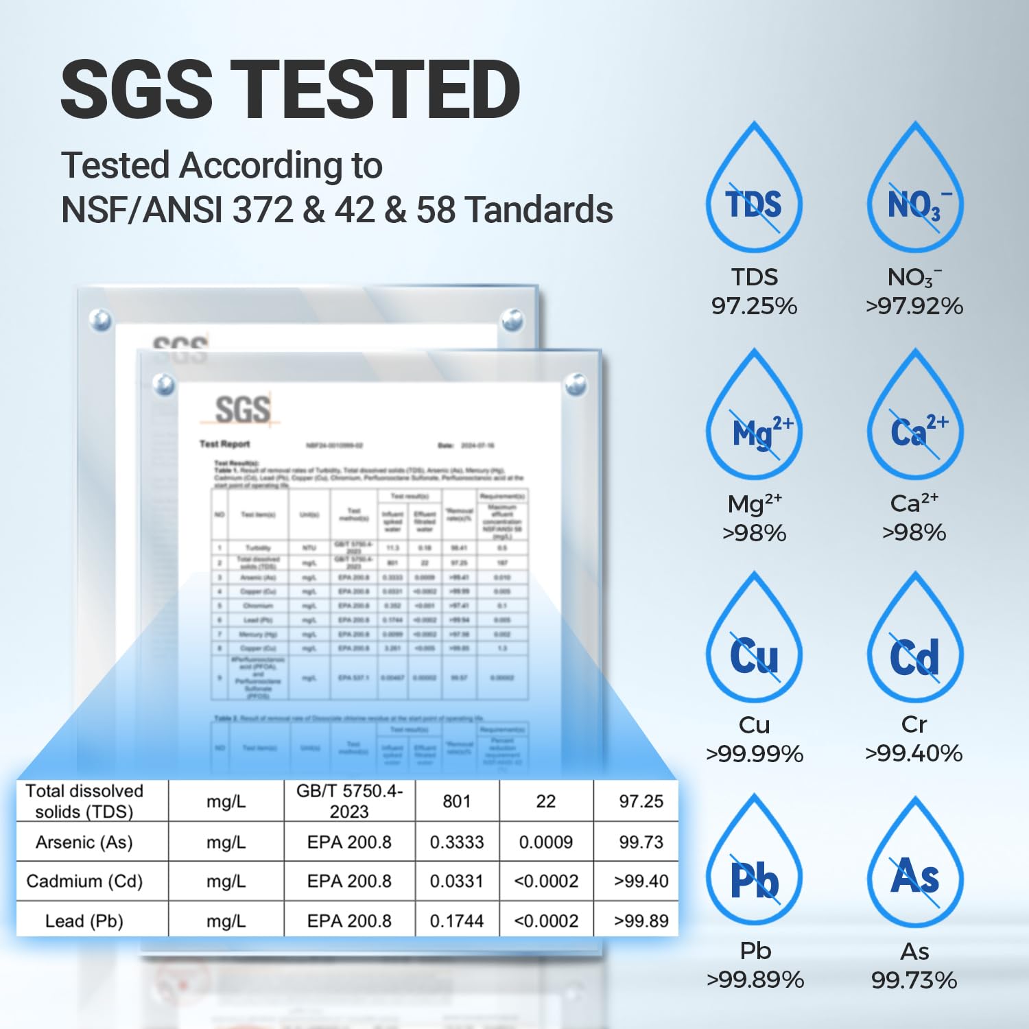 - 8 Stage Filtration: The reverse osmosis system features a 0.0001 μm membrane that effectively filters PFAS, heavy metals like lead, arsenic, and aluminum while the PCT filter enhances taste. This RO system is NSF/ANSI 58 certified for water assurance