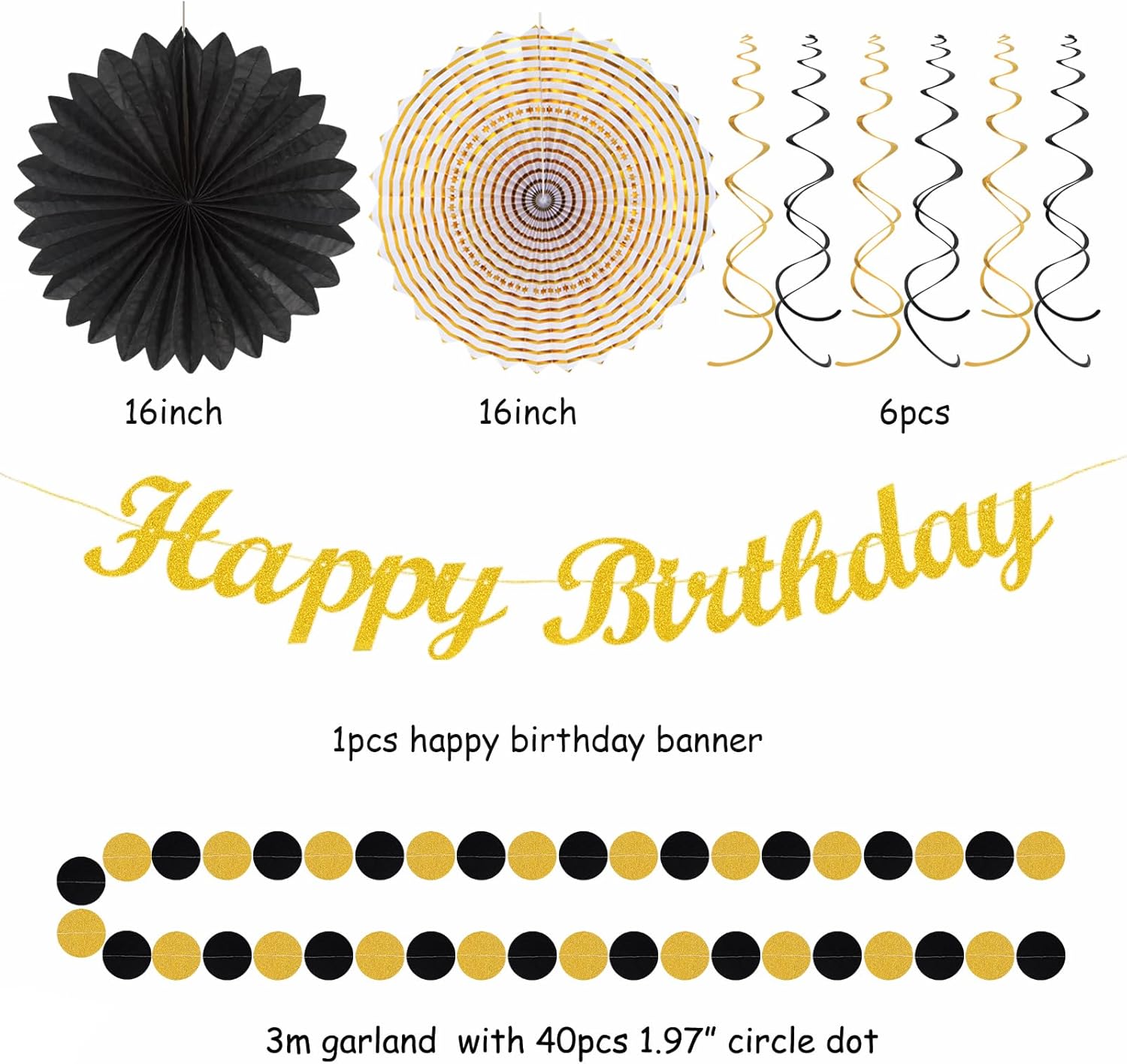 - 【Black Gold Birthday Party kits】This kits include 1pcs happy birthday banner, 1pcs circle dots paper banner, 4pcs tissue pom poms: 3pcs 10" and 1pcs 12" , 3pcs 8inch paper honeycom ball, 2pcs 8inch paper lantern, 4pcs 12inch paper flower fan, 6pcs Paper swirls hanging streamers