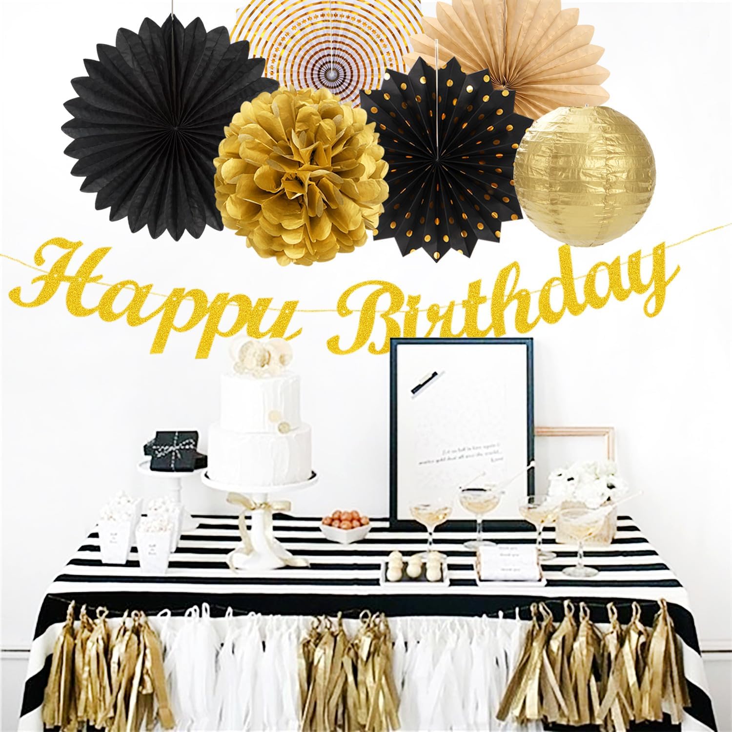 Black Gold Women-Men Birthday Party-decorations - 21pcs Happy Banner,Paper Streamers Lanterns Honeycomb,Tissue Pom Poms Fan,Classroom Birthday Supplies Decor Huglony