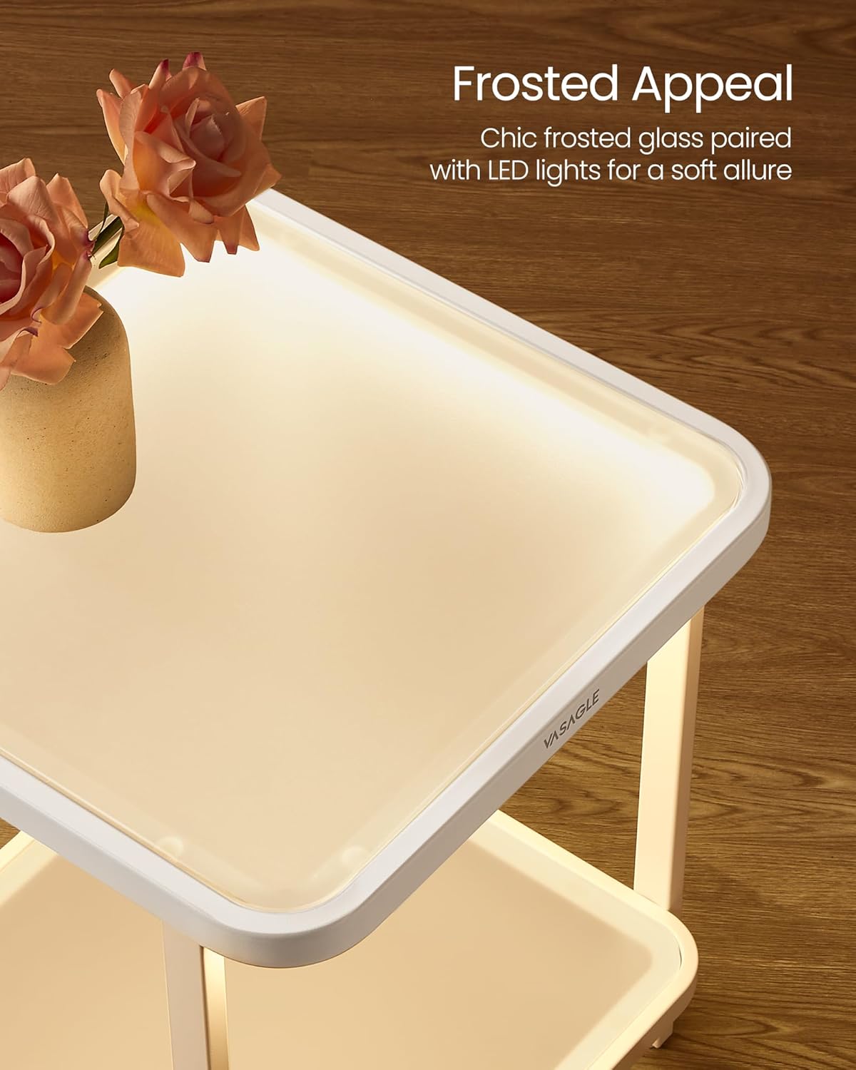 - ăMODERN DESIGNăWith sleek frosted glass shelves and a white steel frame, this 2-tier side table with LED lights exudes modern charm, adding a touch of elegance to your space