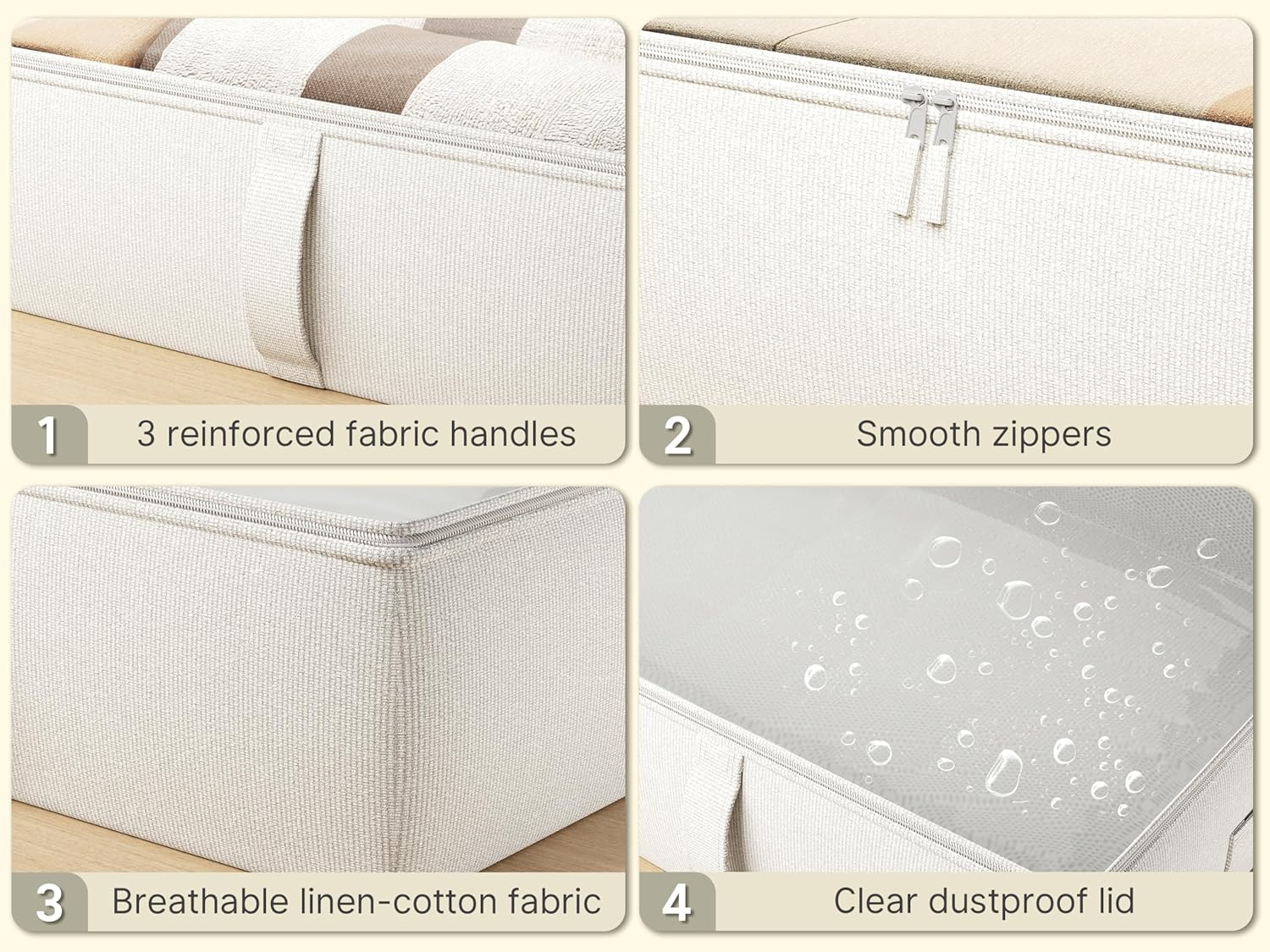 - High Quality Materials - Made of sturdy composite Linen fabric, the storage bins under the bed can hold bulky books and toys without falling apart. Durable handles and dual zippers make it easy to use in daily life. Transparent top cover helps find the items quckly