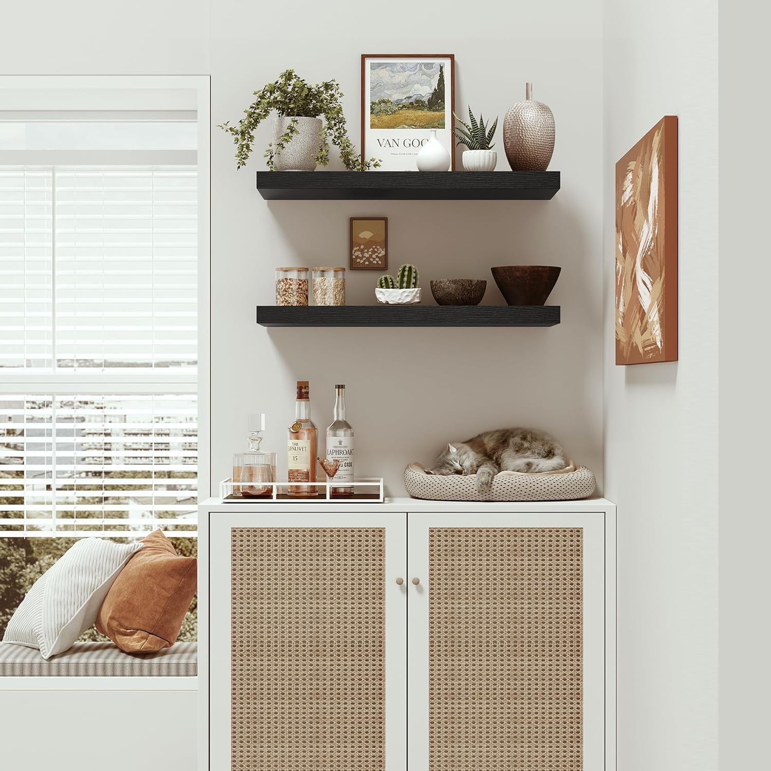 Black Floating Shelves for Wall Mounted, 24 inchs x 9.1” Deep x 1.5” Thick Wall Shelves for Bedroom, Living Room, Bathroom,Kitchen, Office, Home Decor Shelf with Invisible Bracket - Set of 2