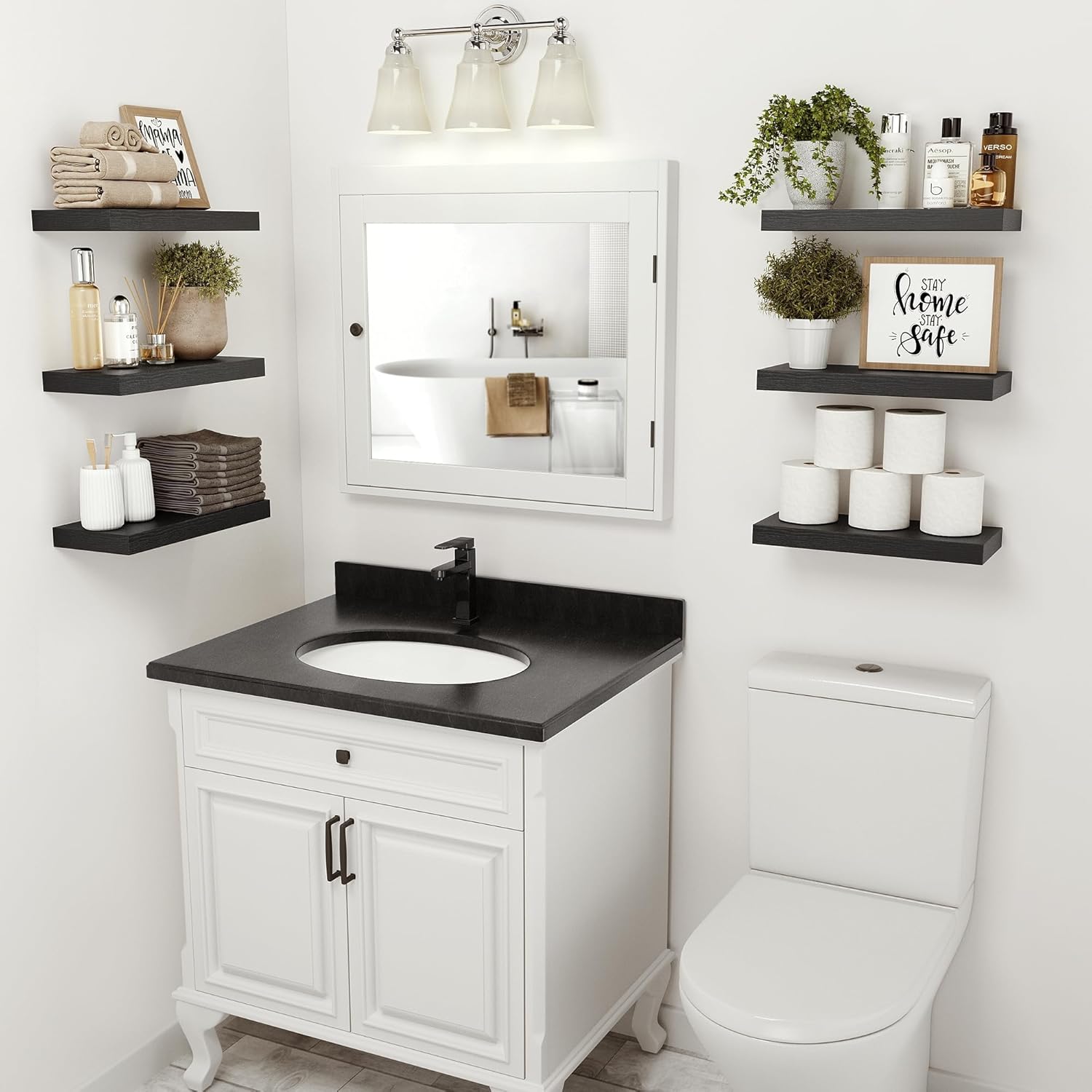 - Engineered Wood & Wall Mounted Design - Slight color differences may occur due to lighting and screen settings.Our MDF bathroom floating shelves for wall are made of wood which grows naturally, so each piece of the board has unique natural wood grain and color. Through the simplest charcoal roasting process, we restore the carbonized color and texture of the wood itself. It highly recommend them for anyone looking to add functional and stylish storage to their bathroom space.