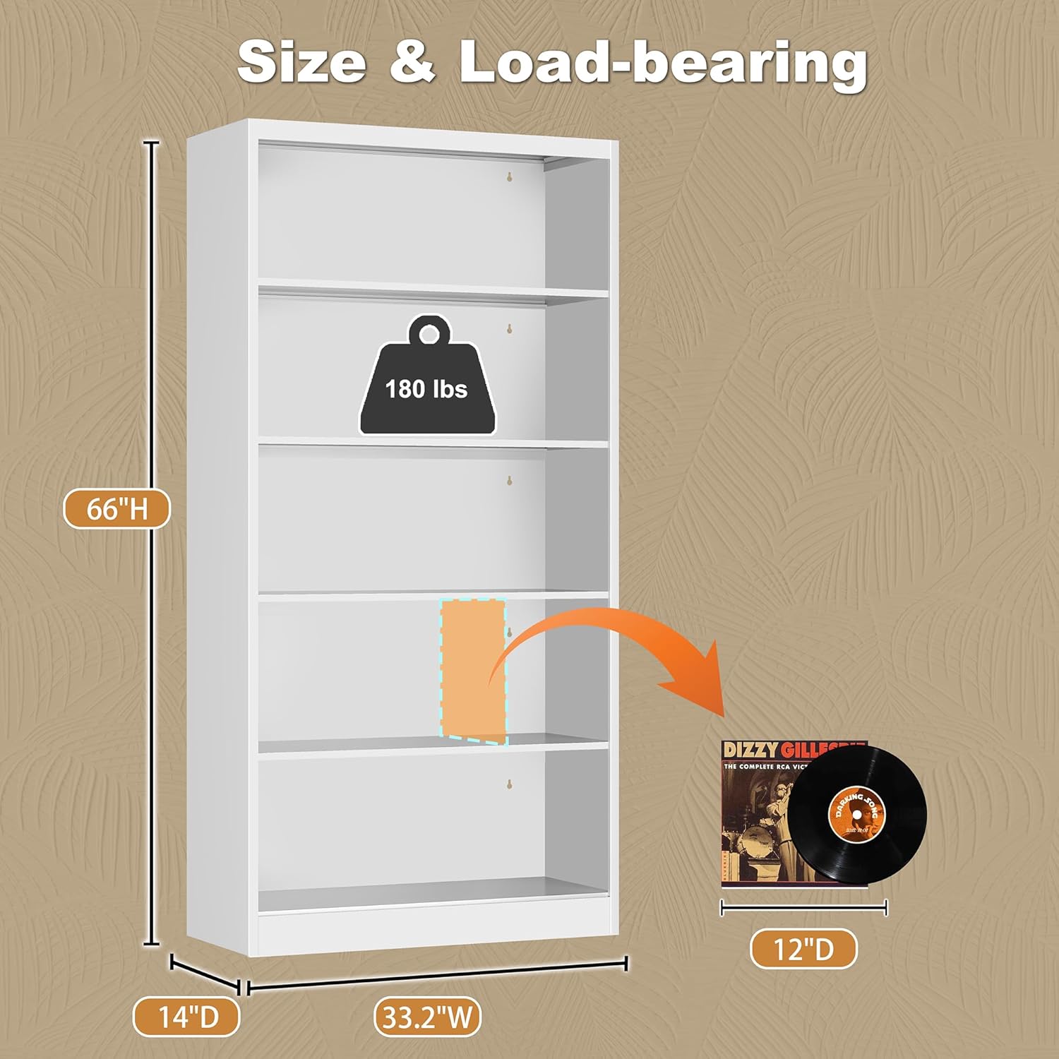 Metal Bookcase, 14" Deep Bookshelf, 66" Tall Bookcases with Adjustable Shelves, 5 Shelf Bookcase, Industrial Bookshelves and Bookcases for Living Room, Office, Library. White Book Shelf.