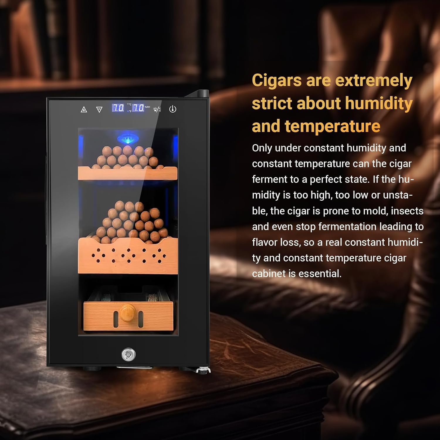 - Innovative Coolingļ¼Experience the power of semiconductor refrigeration technology in our electric humidor, ensuring a silent operation, eco-friendly efficiency, and optimal preservation of your prized cigar collection .