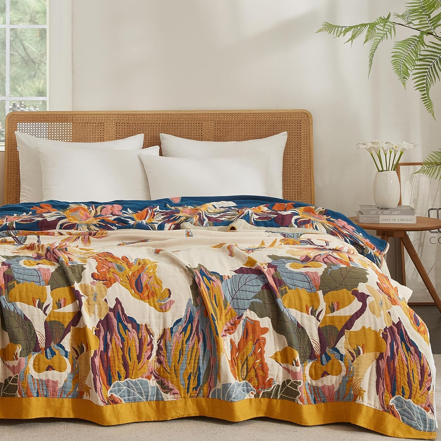 Boho Throw Blanket for Couch Sofa Bed, 100% Cotton Woven Quilt with Tassel 80”x90”, Super Soft Muslin Blanket with Floral Printed, Decorative Reversible Bed Blanket/Cover for All Seasons