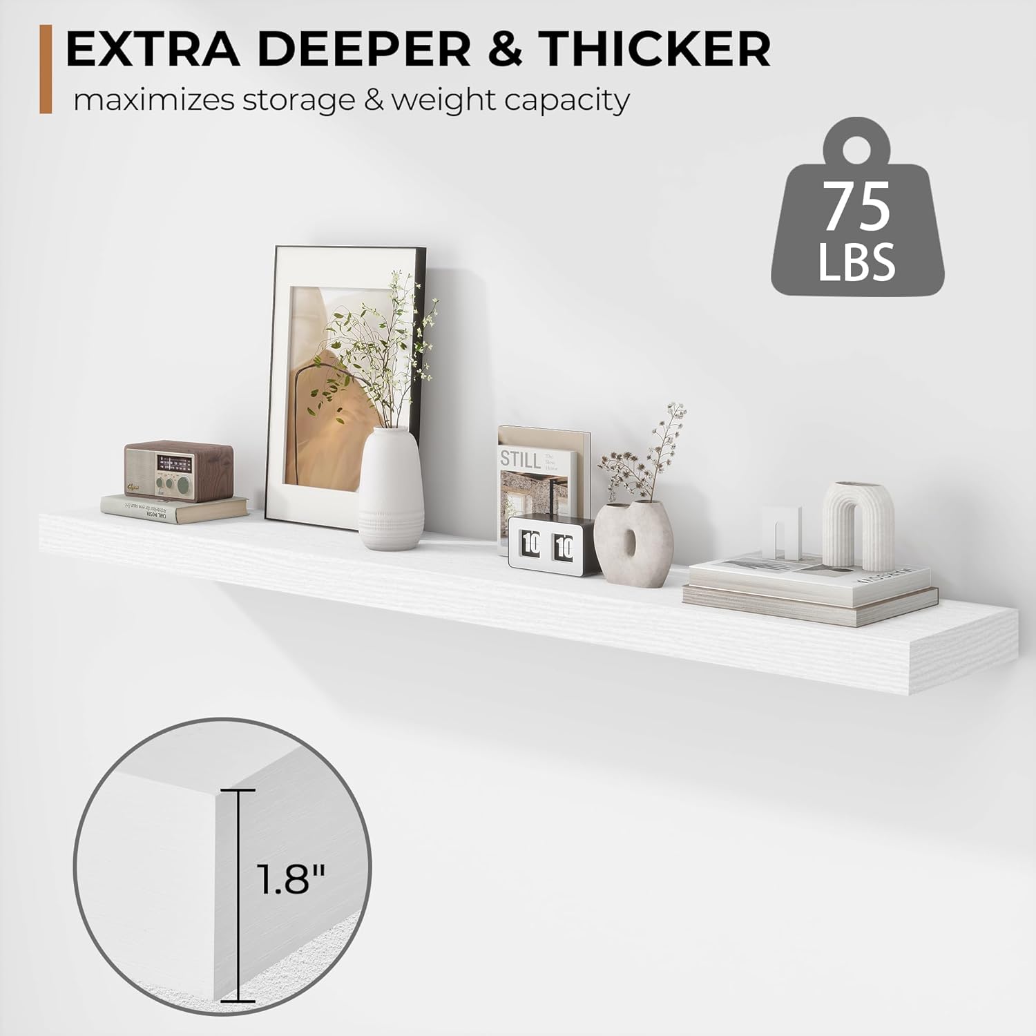 - Extra Deeper & Thicker - Each board measures 48"W x 8"D x 1.8"H. Extra deeper and thicker design in order to bring maximizes storage space and weight capacity, even hold up to 75 lb each. This floating shelf taking up zero square feet, reduces clutter and highlights dƩcor in compact spaces.