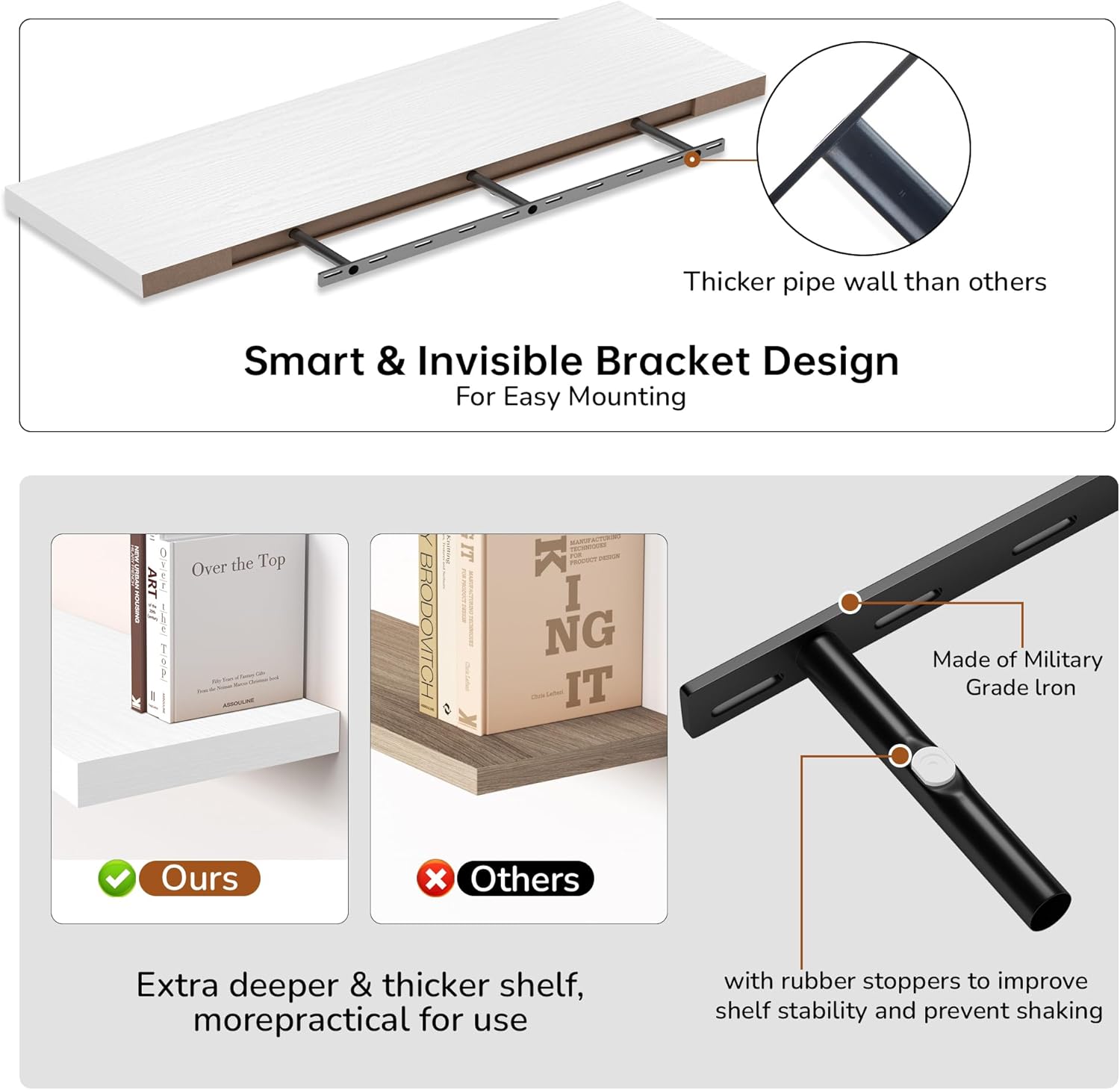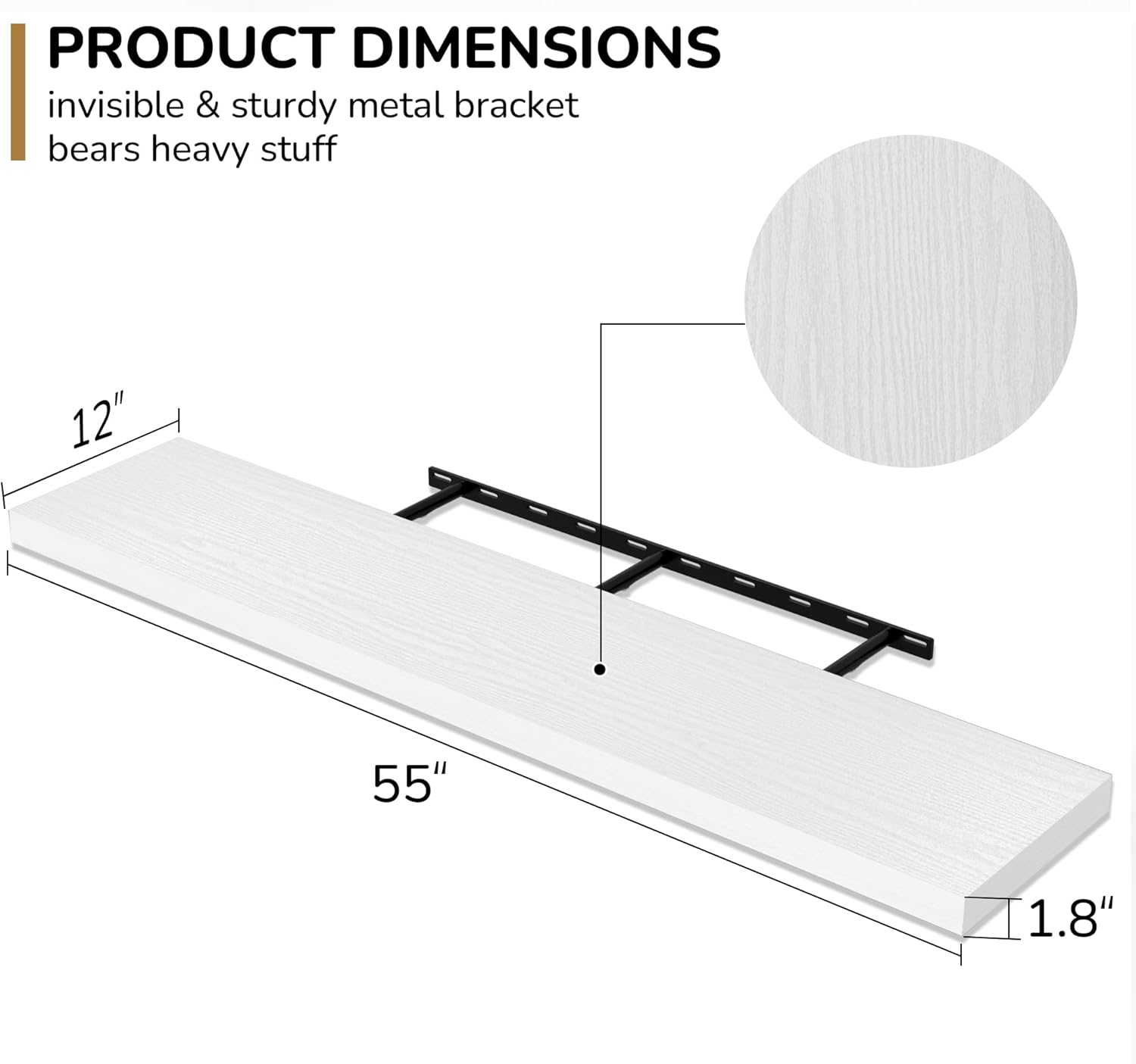 - Extra Deeper & Thicker - Each board measures 55"W x 12"D x 1.8"H. Extra deeper and thicker design in order to bring maximizes storage space and weight capacity, even hold up to 80 lb each. This floating shelf taking up zero square feet, reduces clutter and highlights dƩcor in compact spaces.