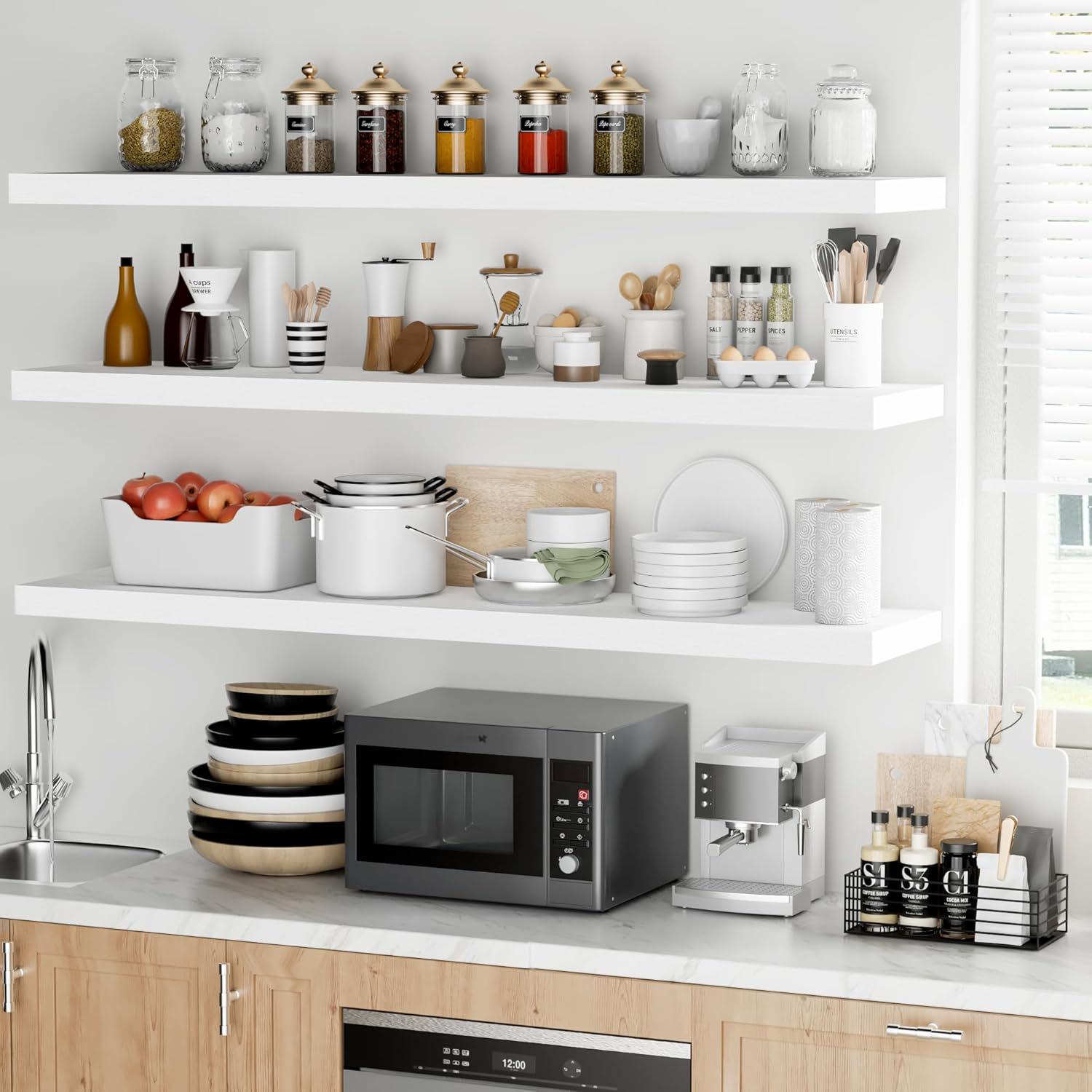 - Versatile & Multi-Scene Functionality: Our floating shelves are available in a variety of sizes and thicknesses, allowing you to choose the perfect fit for your space. Use them in the bathroom to store beauty products, hair care items. In the bedroom, they can hold books, cosmetics, and personal items. In the kitchen, theyāre perfect for spices, jars, or small utensils. Or display photo frames, trophies, or collections in the living room. These shelves efficiently use wall space to create a tidier, more spacious feel in any room.