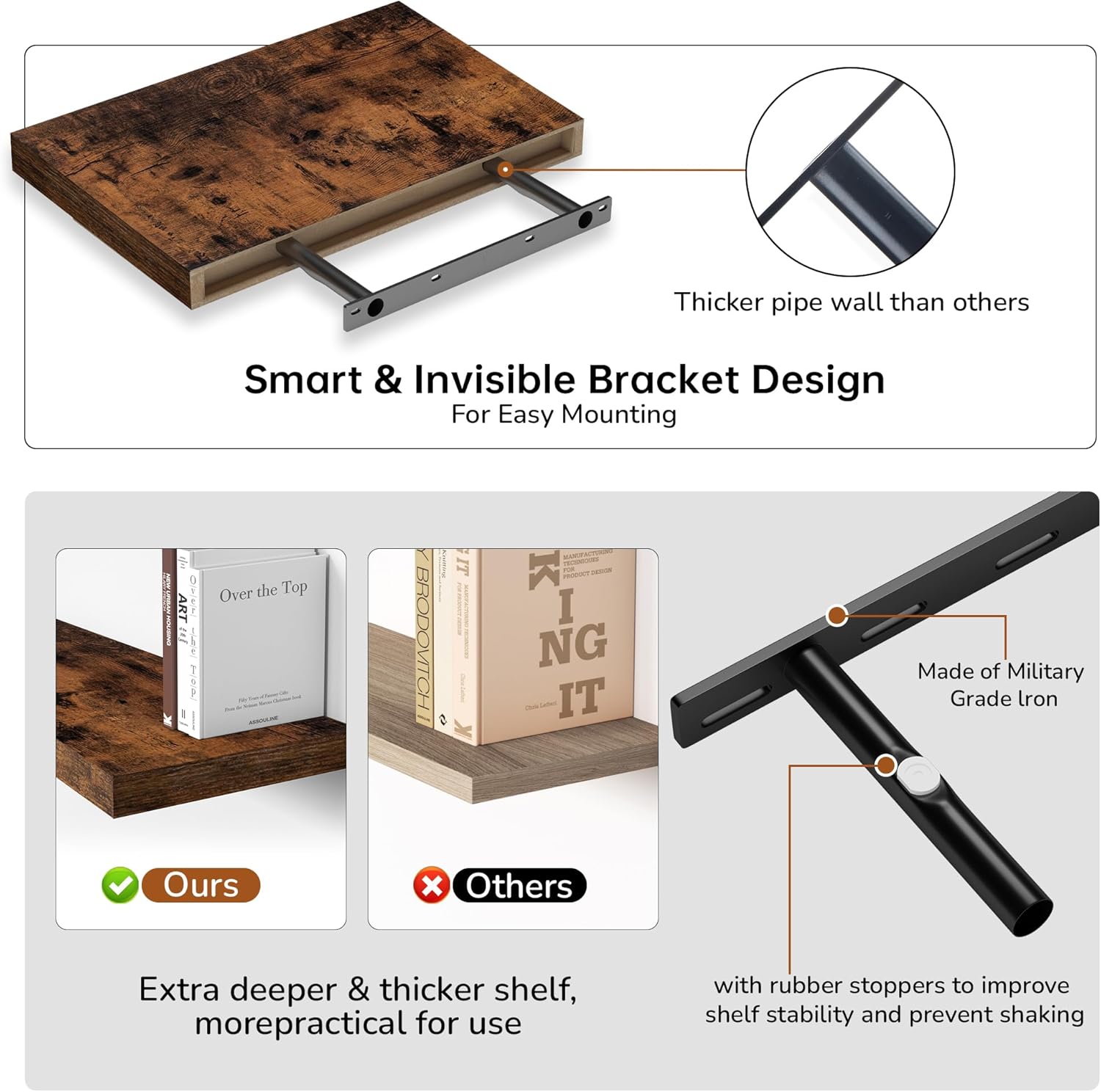 - Rustic & Modern Wooden Floating Shelves: Crafted from durable engineered wood with a realistic wood grain finish, our floating shelves offer the perfect blend of rustic charm and modern minimalism. The matte surface enhances its sleek, contemporary look, making it ideal for any room in your home. Whether you want to display your collection or organize essentials, these wall shelves seamlessly integrate with any dƩcor and can be mounted on any wall to elevate your living space.