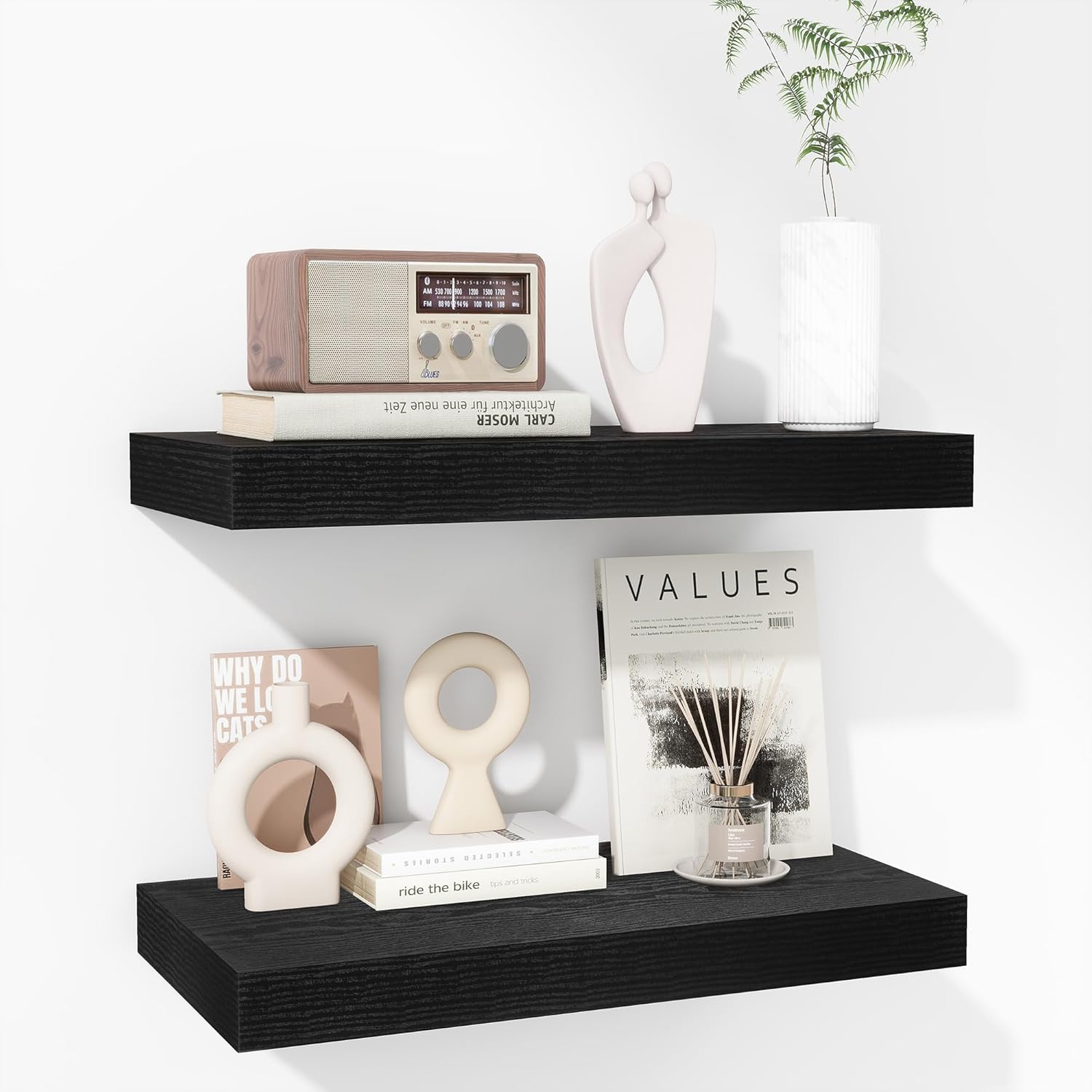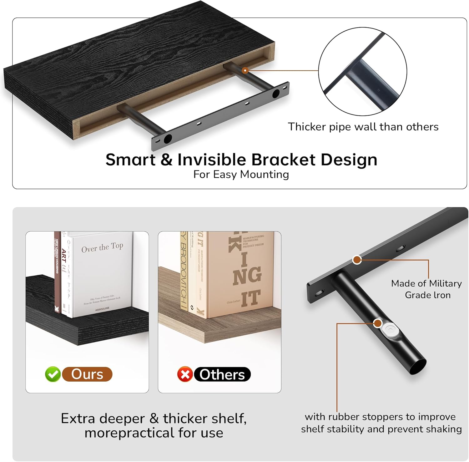 Fun Memories 16 Inch Floating Shelves - Deep Rustic Black Wooden Wall Shelves - Extra Deeper & Thicker Wall Mounted Storage Shelf for Bedroom, Kitchen, Farmhouse - 2 Pack, Rustic Black