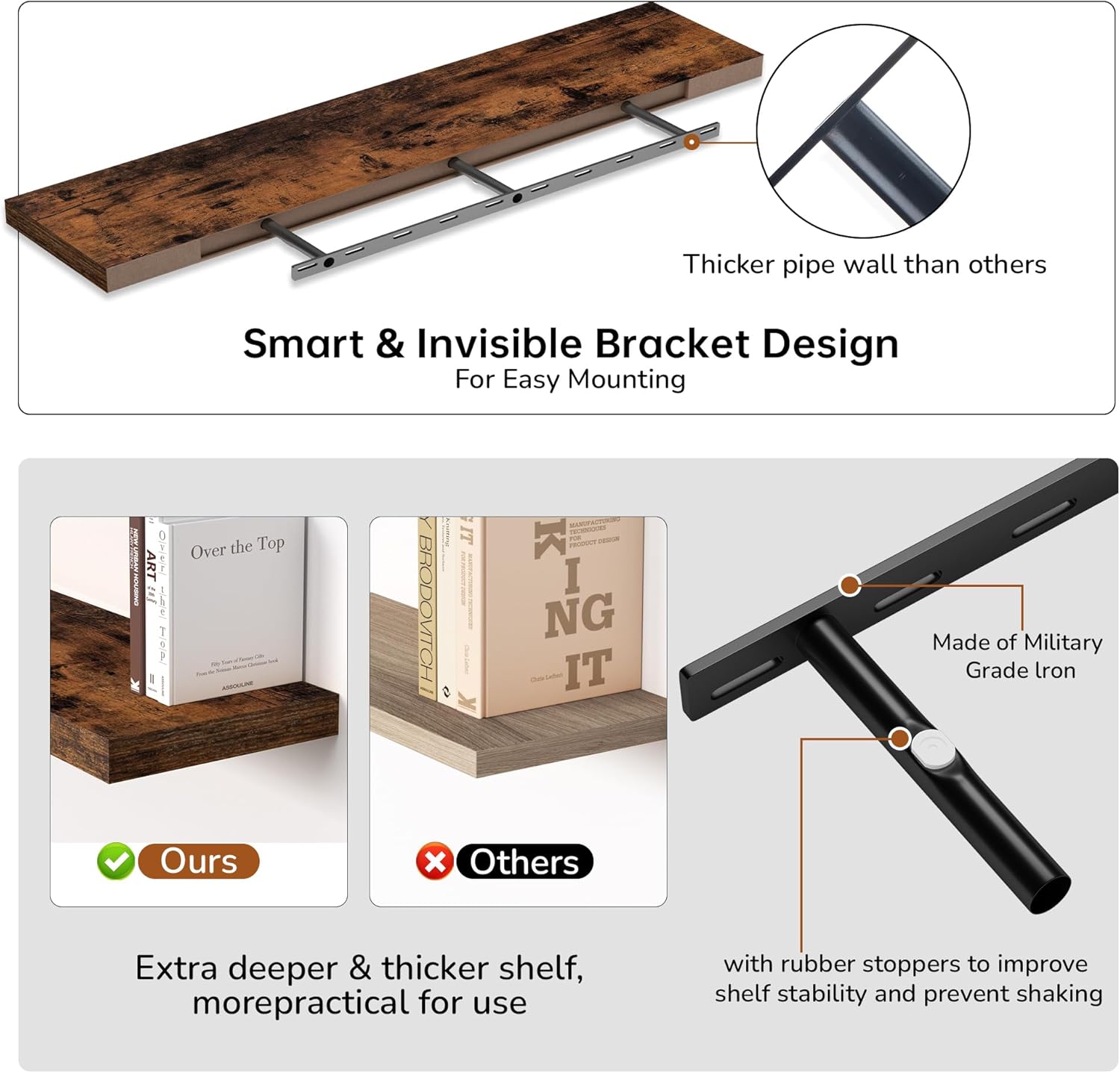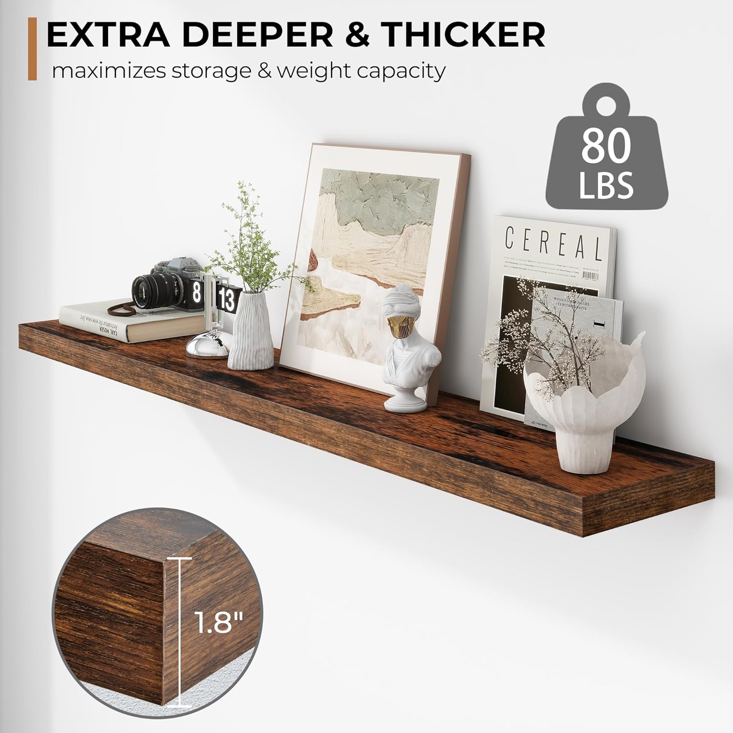 - Extra Deeper & Thicker - Each board measures 55"W x 9.3"D x 1.8"H. Extra deeper and thicker design in order to bring maximizes storage space and weight capacity, even hold up to 80 lb each. This floating shelf taking up zero square feet, reduces clutter and highlights dƩcor in compact spaces.