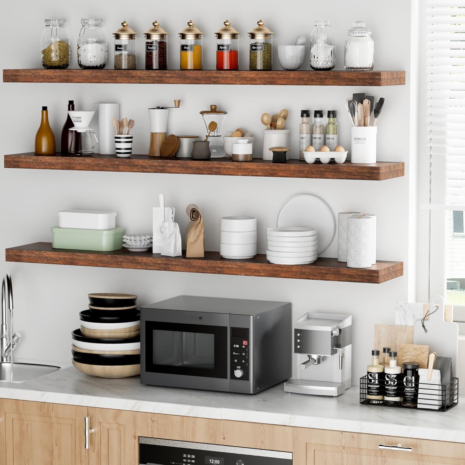 - Rustic & Modern Wooden Floating Shelves: Crafted from durable engineered wood with a realistic wood grain finish, our floating shelves offer the perfect blend of rustic charm and modern minimalism. The matte surface enhances its sleek, contemporary look, making it ideal for any room in your home. Whether you want to display your collection or organize essentials, these wall shelves seamlessly integrate with any dƩcor and can be mounted on any wall to elevate your living space.