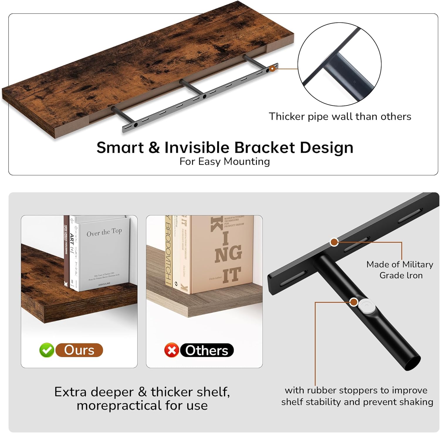 - Extra Deeper & Thicker - Each board measures 48"W x 12"D x 1.8"H. Extra deeper and thicker design in order to bring maximizes storage space and weight capacity, even hold up to 75 lb each. This floating shelf taking up zero square feet, reduces clutter and highlights dƩcor in compact spaces.