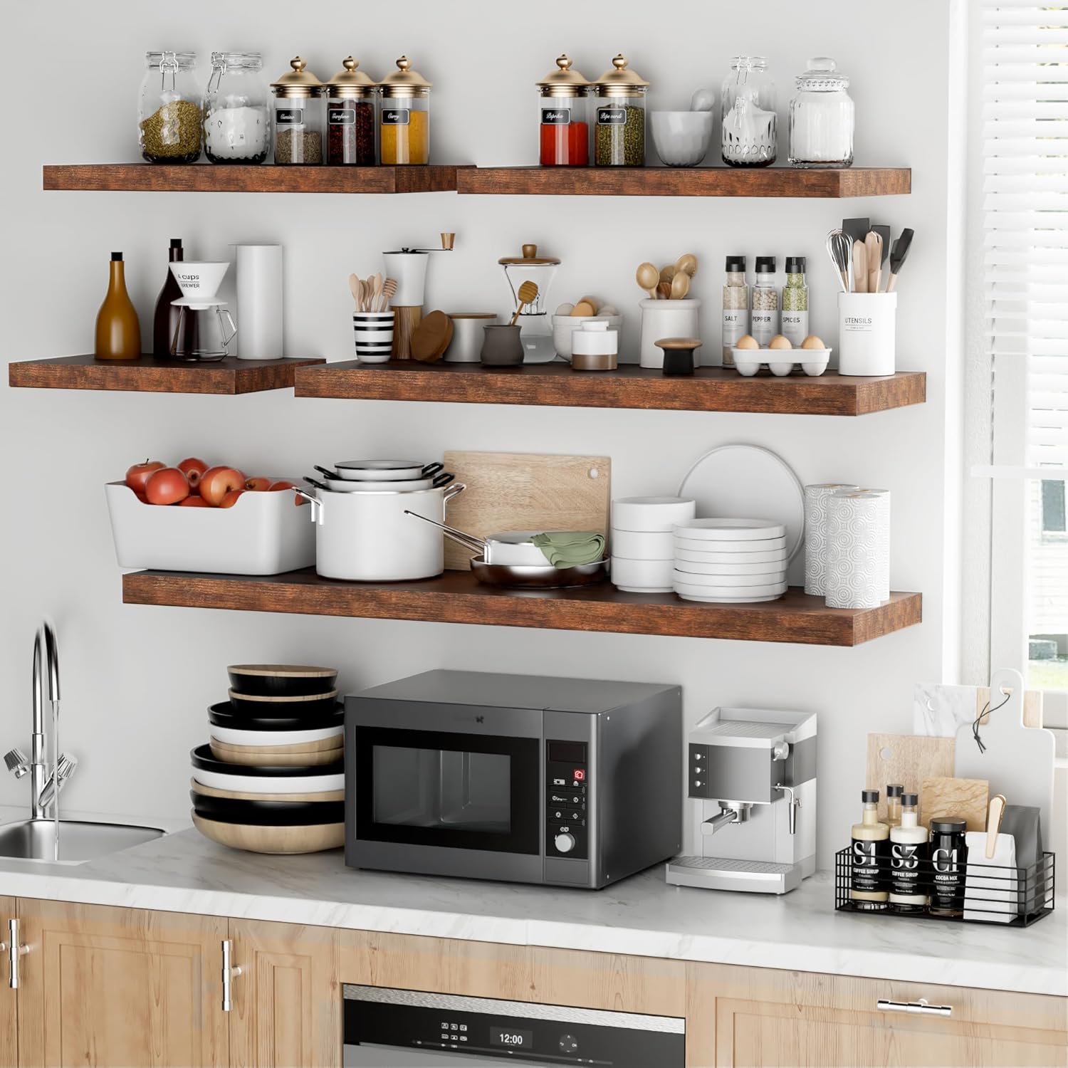 - Rustic & Modern Wooden Floating Shelves: Crafted from durable engineered wood with a realistic wood grain finish, our floating shelves offer the perfect blend of rustic charm and modern minimalism. The matte surface enhances its sleek, contemporary look, making it ideal for any room in your home. Whether you want to display your collection or organize essentials, these wall shelves seamlessly integrate with any dƩcor and can be mounted on any wall to elevate your living space.