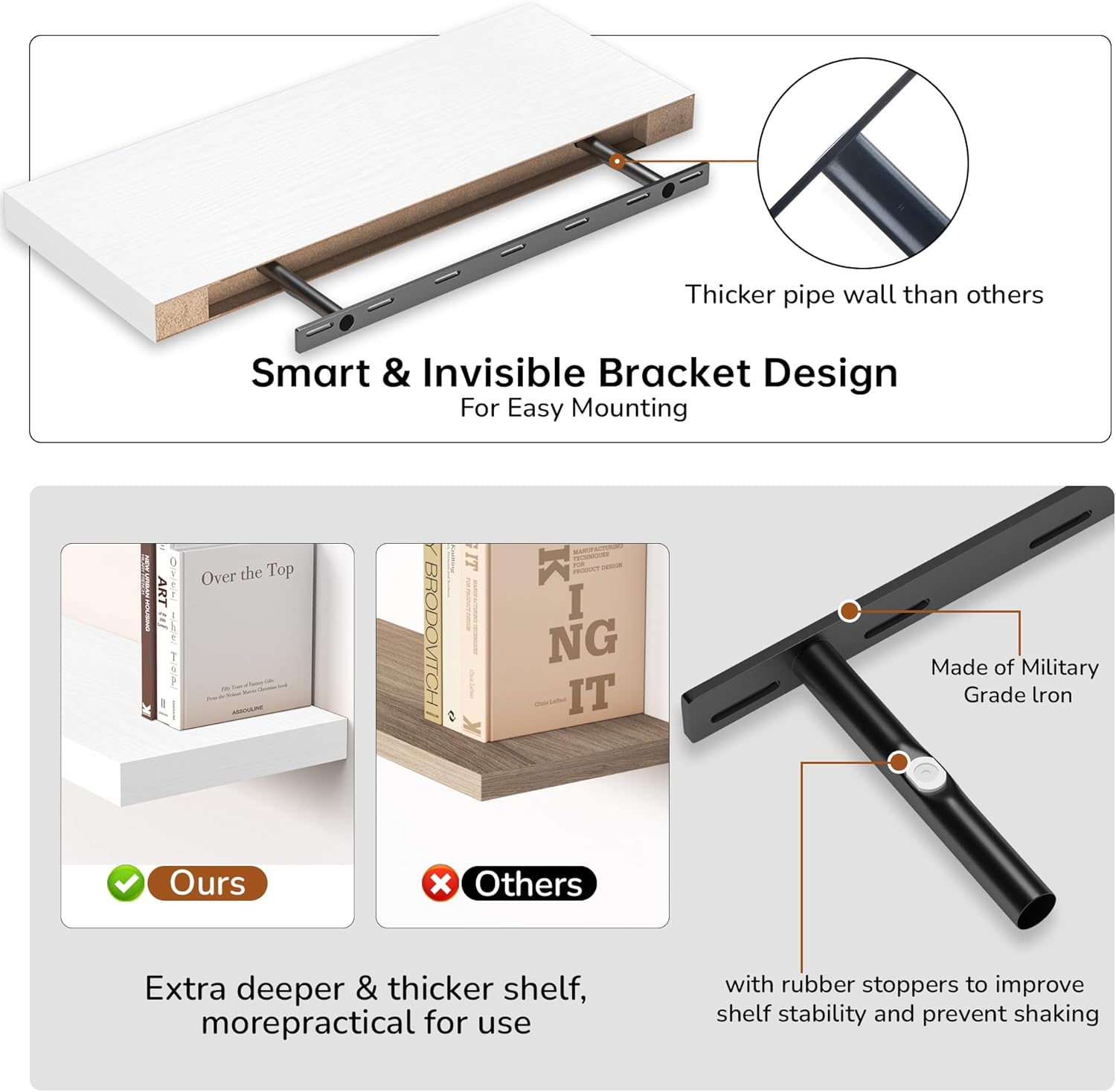 - Extra Deeper & Thicker - Each board measures 24"W x 8"D x 1.5"H. Extra deeper and thicker design in order to bring maximizes storage space and weight capacity, even hold up to 50 lb each. This floating shelf taking up zero square feet, reduces clutter and highlights dƩcor in compact spaces.