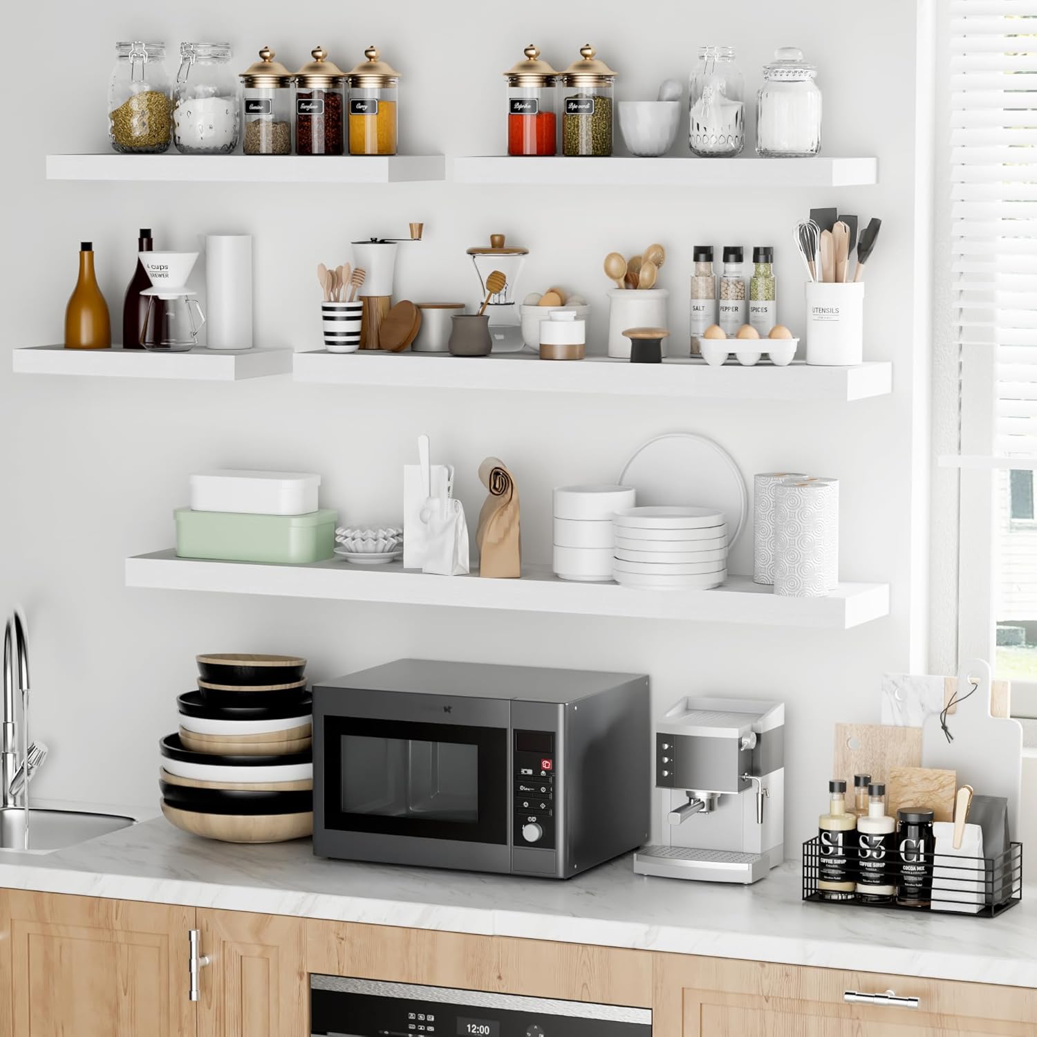 - Versatile & Multi-Scene Functionality: Our floating shelves are available in a variety of sizes and thicknesses, allowing you to choose the perfect fit for your space. Use them in the bathroom to store beauty products, hair care items. In the bedroom, they can hold books, cosmetics, and personal items. In the kitchen, theyāre perfect for spices, jars, or small utensils. Or display photo frames, trophies, or collections in the living room. These shelves efficiently use wall space to create a tidier, more spacious feel in any room.