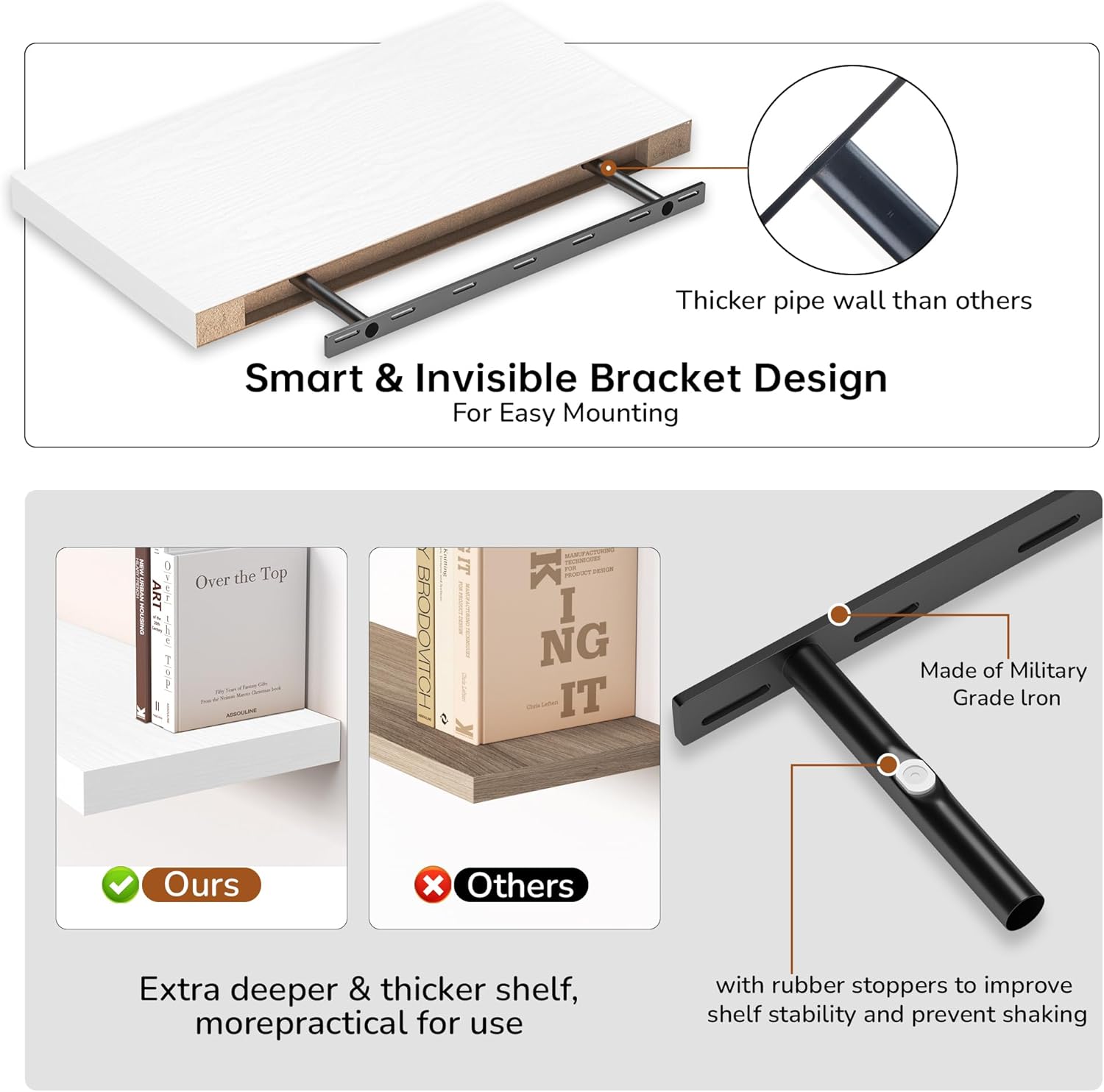 - Extra Deeper & Thicker - Each board measures 24"W x 12"D x 1.5"H. Extra deeper and thicker design in order to bring maximizes storage space and weight capacity, even hold up to 50 lb each. This floating shelf taking up zero square feet, reduces clutter and highlights dƩcor in compact spaces.