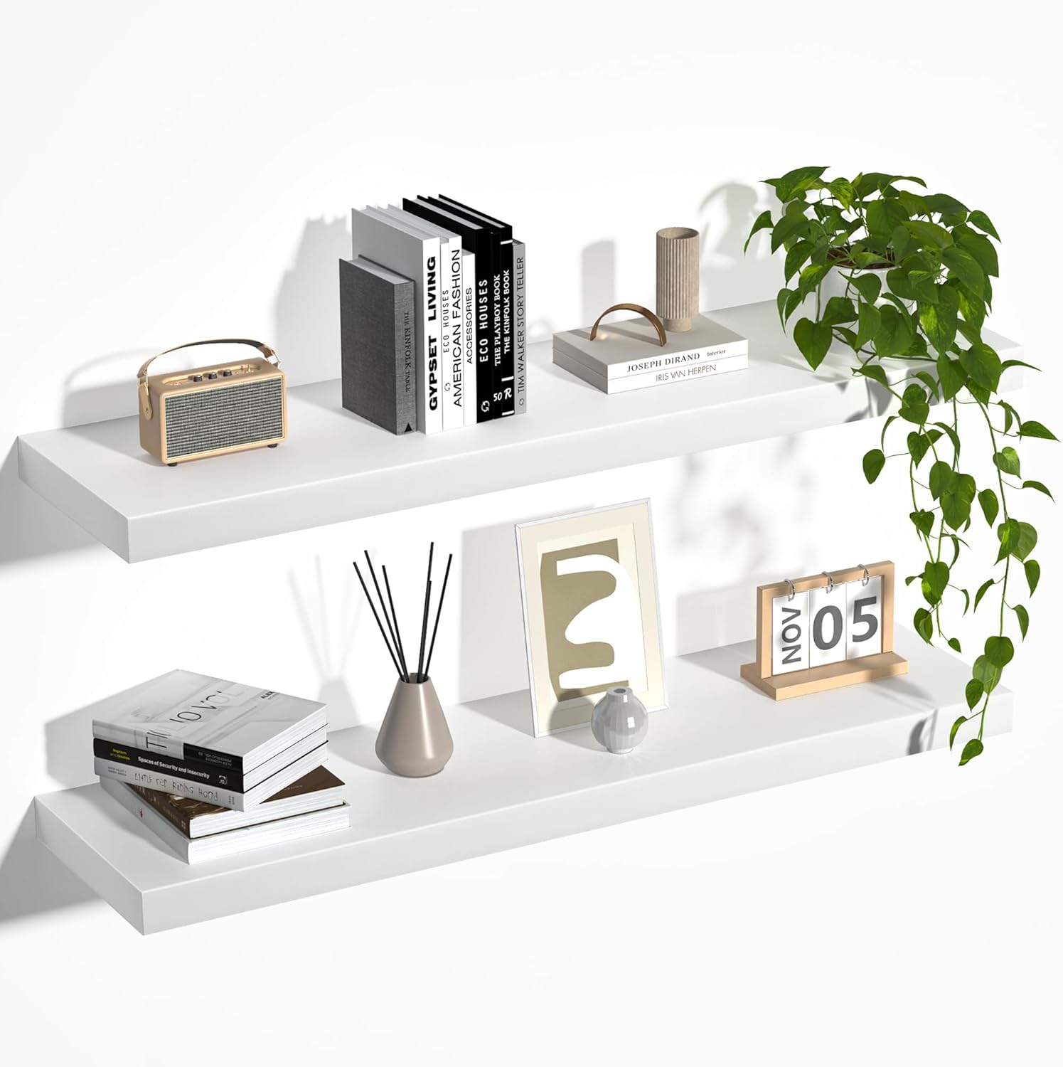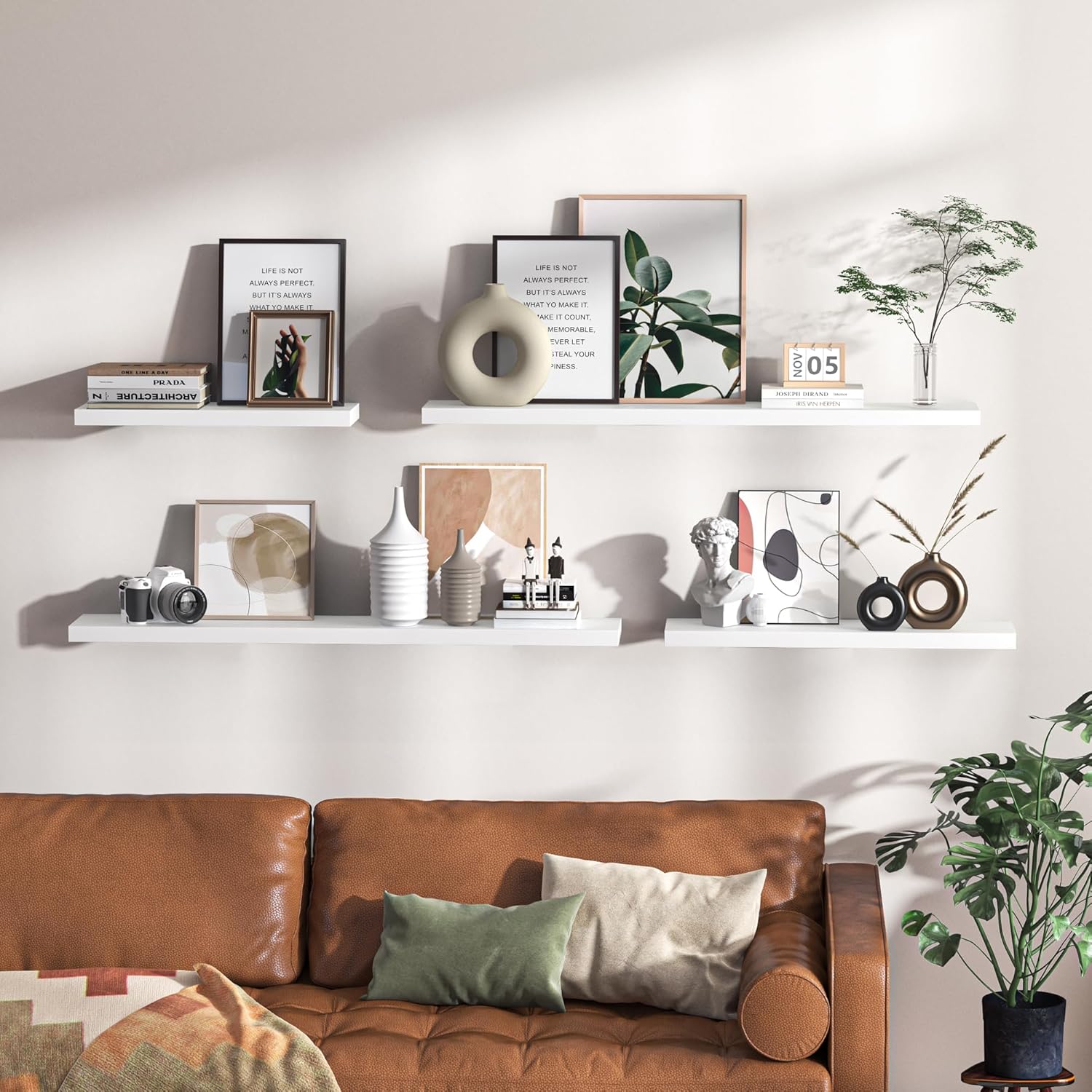 - Multi-scene & Functional - Our wall-mounted shelves are not only aesthetically pleasing but also highly functional, making them an ideal choice for various settings in your home. Use them to showcase your collection, display books, or highlight prized possessions. These shelves are perfect for exhibiting photo frames, small plants, models, or audio equipment in your living room, office, or study.