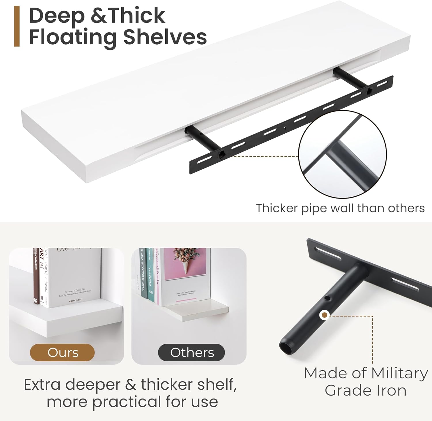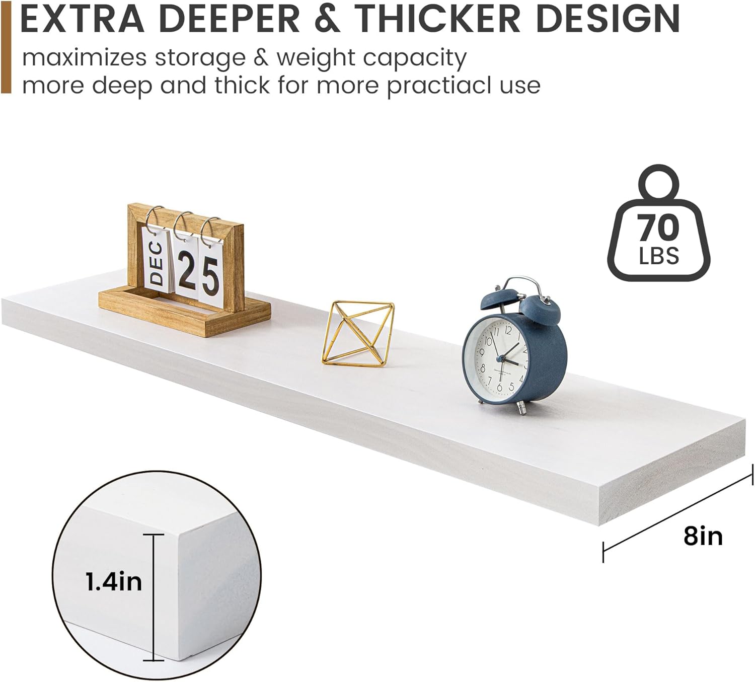 - Extra Deeper & Thicker for Storage - Each board measures 30"W x 8"D x 1.4"H. Extra deeper and thicker design in order to bring maximizes storage space and weight capacity, even hold up to 70 lb. This floating shelf taking up zero square feet, reduces clutter and highlights dƩcor in compact spaces. It can help make full use of the empty wall, making it much more space-saving and making your room look larger and tidier.