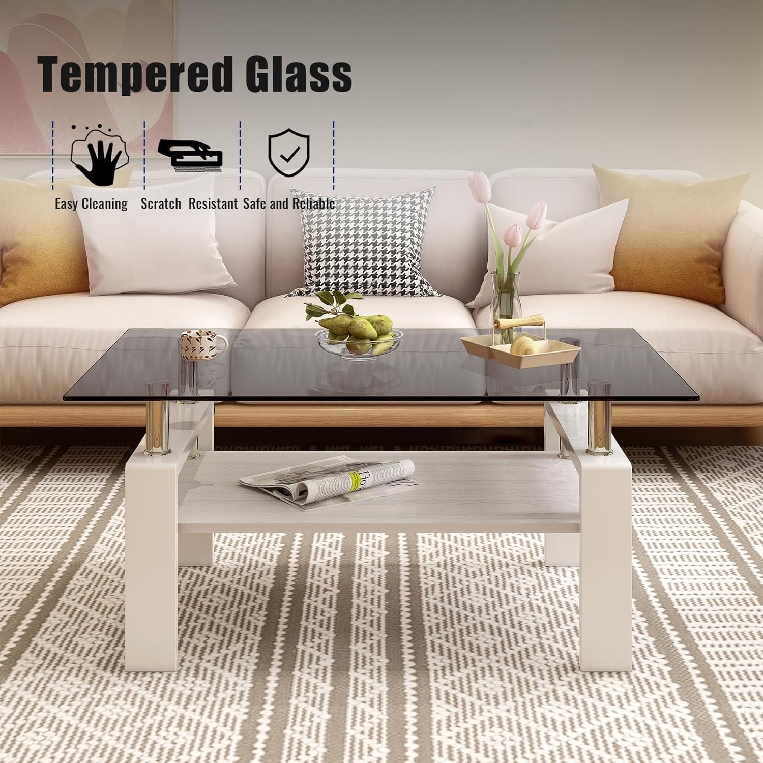 Glass Coffee Table Rectangle Living Room Center Table, with Gray Tempered Glass Tabletop and White MDF Layer,for Living Room and Office, Gray+White