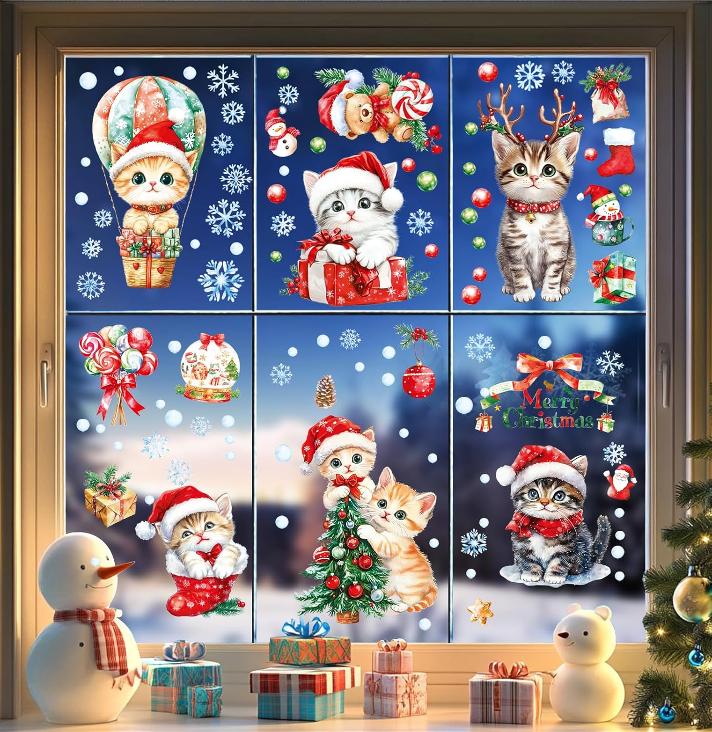 Christmas Window Clings Decorations - Cute Funny Double-Sided Static Stickers for Glass Windows and Doors, Perfect Decorations, with Cat Kitten Pattern, Reusable 9 Sheets