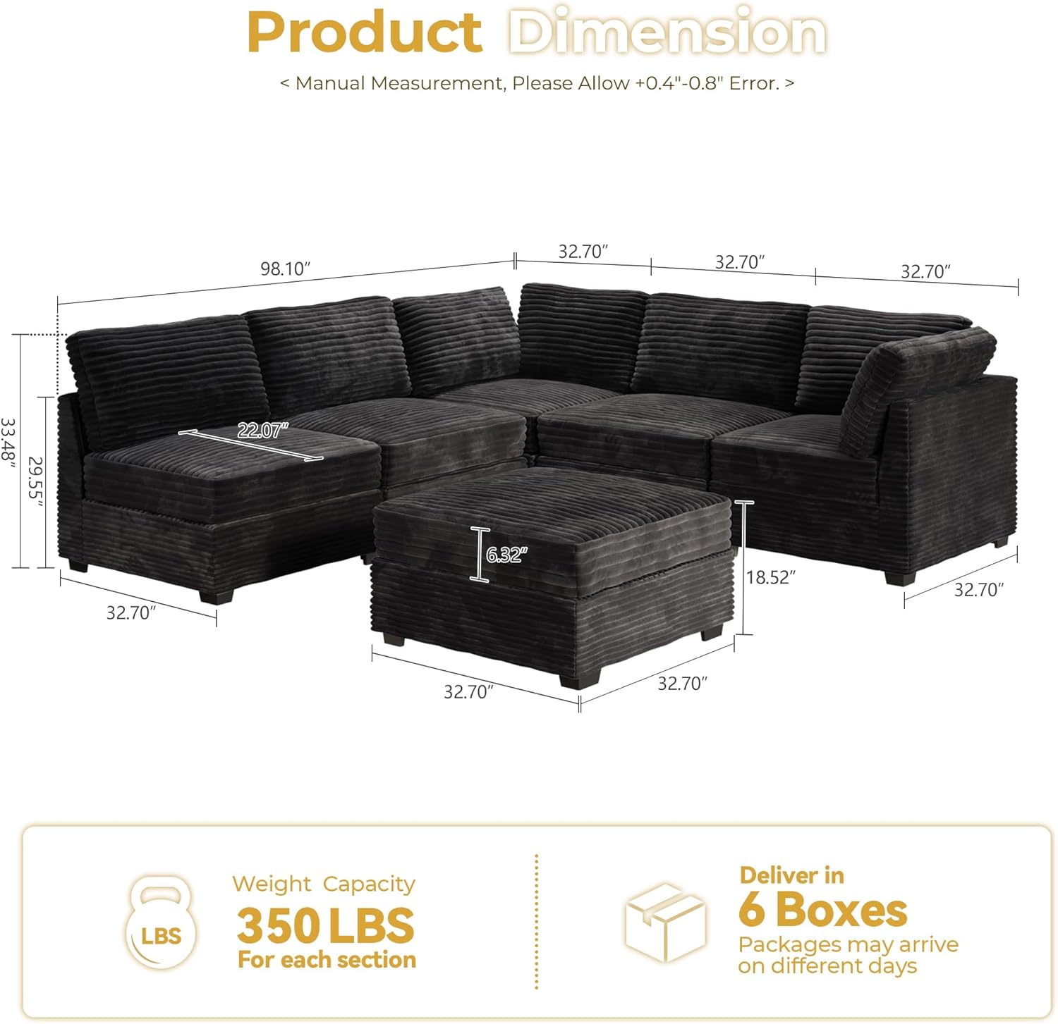 HOOOWOOO Modular Sectional Sofa,6 Pieces Sectional Couches for Living Room,98X98 L Shaped Cloud Couch with Ottoman Chaise Set(Black Velvet Corduroy)