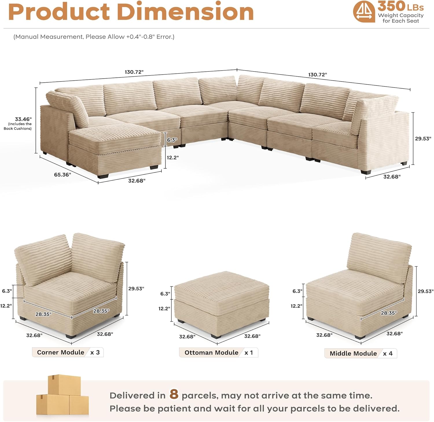 ovios Sectional Sofa Couch with L-Shape Chaise Ottoman, Comfy Modular Cloud Couches with Deep Seat, Modern Upholstered Plush Corduroy Sofas Set for Living Room, 8-Seater, Beige
