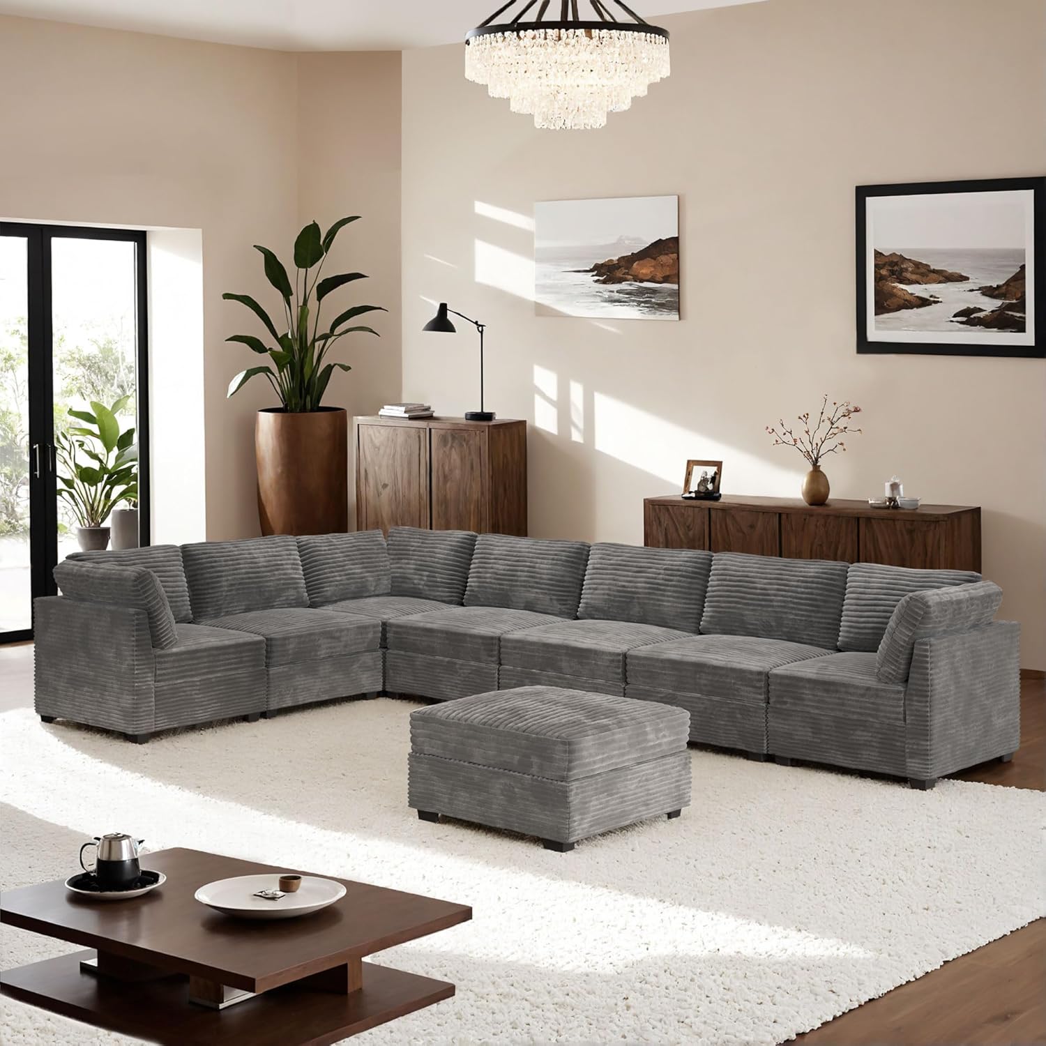 ovios Sectional Sofa Couch with L-Shape Chaise Ottoman, Comfy Modular Cloud Couches with Deep Seat, Modern Upholstered Plush Corduroy Sofas Set for Living Room, 8-Seater, Grey
