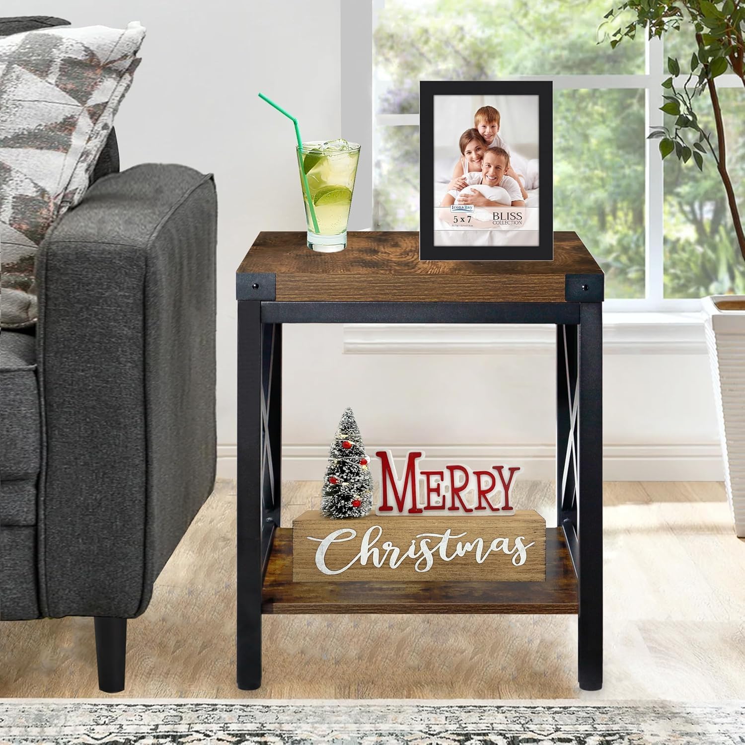 End Table Large Side Table for Living Room, Rustic Farmhouse End Tables with 2-Tier Storage, Square Nightstand Bedside Table X-Design Metal Frame, Brown (Wind, Brown)